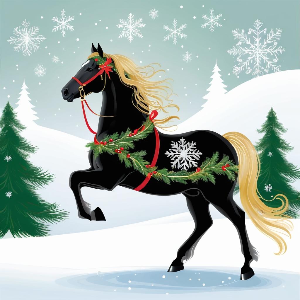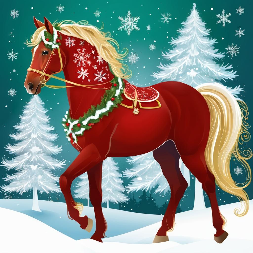 将马的优雅姿态融入节日氛围中,背景可以设计为雪地场景,添加一棵装饰华丽的圣诞树。使用金色和银色的装饰品点缀马的轮廓,比如在马的鬃毛和尾巴上添加金色丝带。整体设计应保持简洁,但通过色彩和背景元素营造节日的温暖感。
