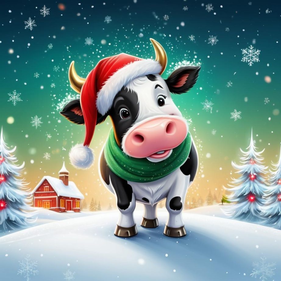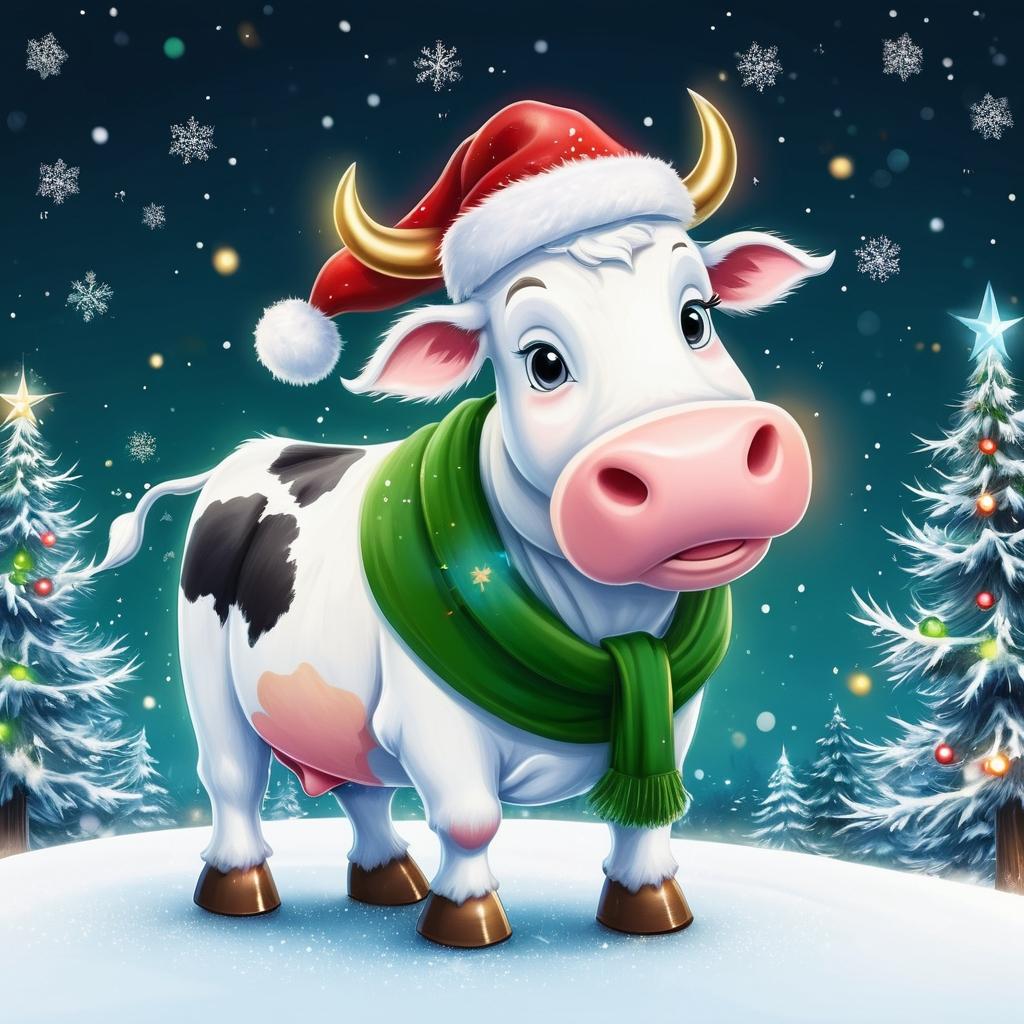 如何将一张简单的卡通小牛插画转化为节日气氛浓厚的圣诞贺卡?关键在于充分利用小牛的友好形象,并通过添加节日装饰来增强圣诞氛围。为小牛戴上红色的圣诞帽和绿色的围巾,使其瞬间充满节日气息。背景可以是一片柔和的雪景,点缀着灯光和圣诞树。通过这些元素的巧妙结合,整个画面不仅保留了卡通的可爱风格,还增添了温馨的节日感染力。这样的设计既能带来视觉上的愉悦,也能传达节日的欢乐与温暖。