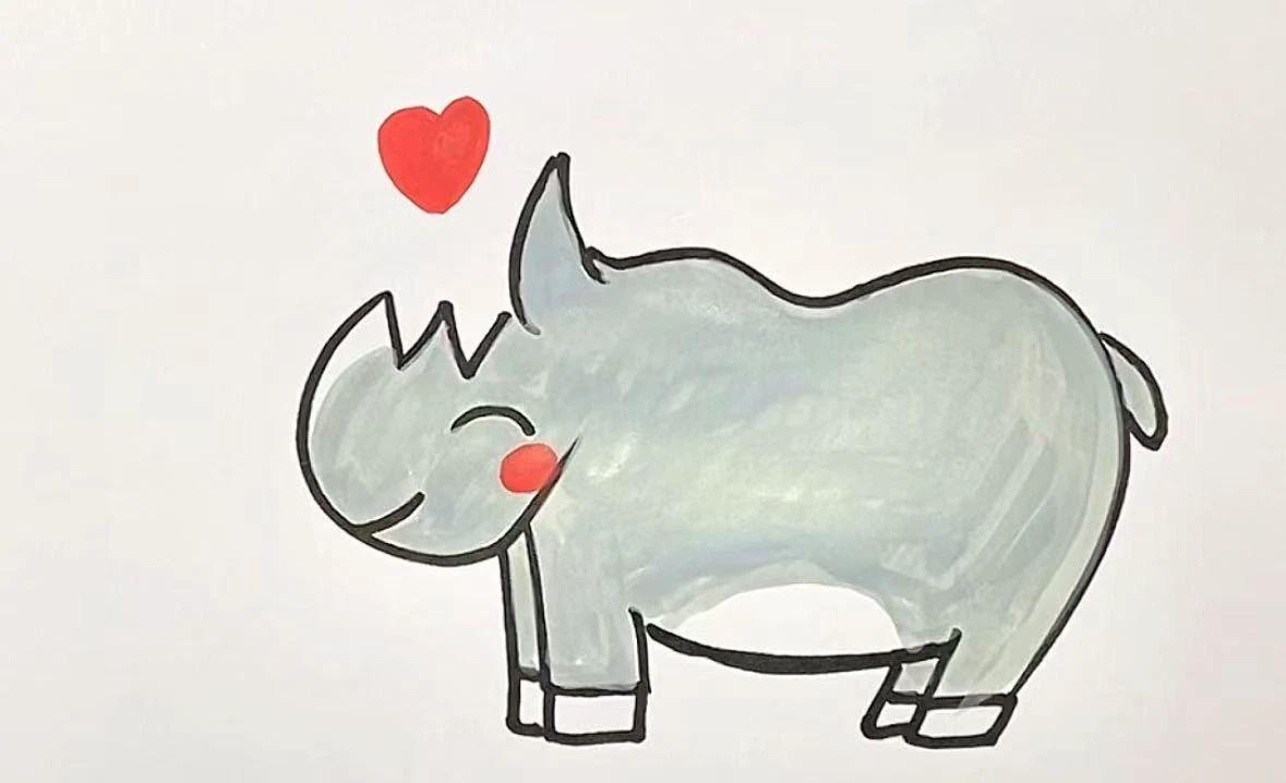 这幅图是一个简约风格的卡通犀牛形象,具有夸张的表情和红色的脸颊,头顶漂浮着一个红色的心形图案。整体风格可爱且生动,但没有明显的圣诞元素。可以通过添加圣诞帽、围巾或背景中的雪花等元素来增强节日氛围。