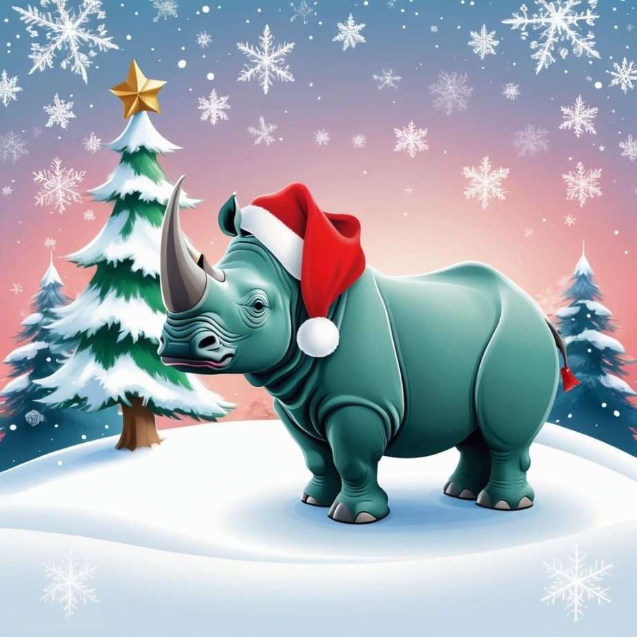 将这只卡通犀牛融入圣诞场景中,例如为它戴上圣诞帽和围巾,背景增加雪花或圣诞树元素。红色心形可以变成圣诞装饰球,周围添加礼物盒和暖色灯光,营造出温馨的节日气氛。