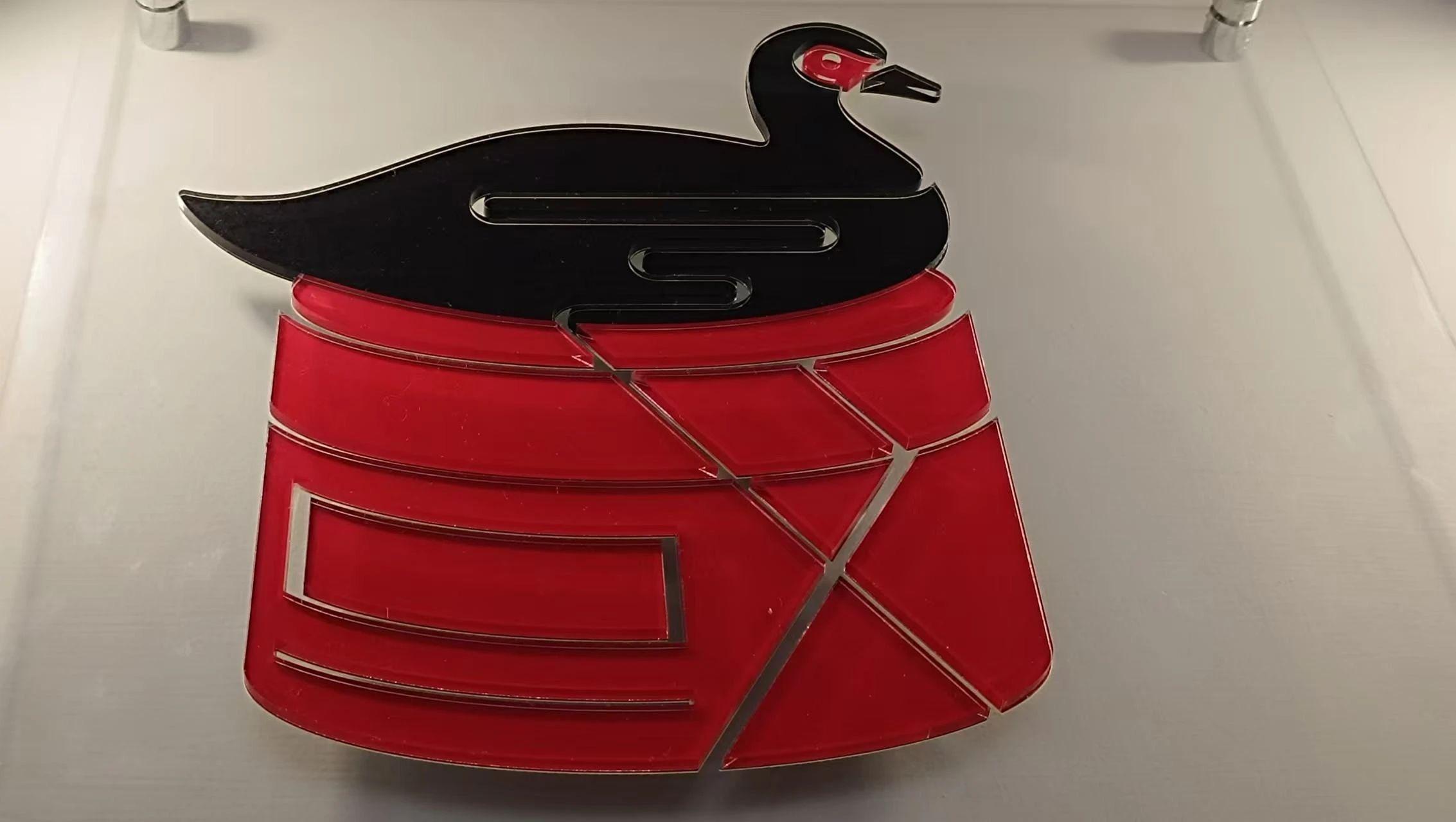 该作品展示了一个抽象的鸭子形象,主体色彩为黑色和红色。鸭子的造型简约,使用了几何形状和鲜明的颜色对比。虽然缺乏直接的圣诞元素,但红色的运用可以与圣诞主题中的红色相结合。形态上,鸭子呈现出一种宁静的姿态,适合传达温馨与和平的节日情感。