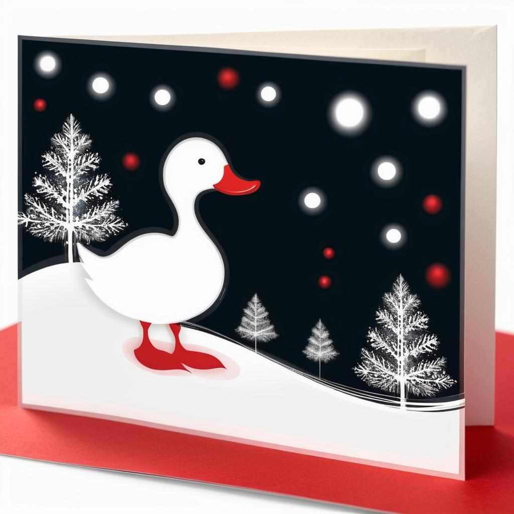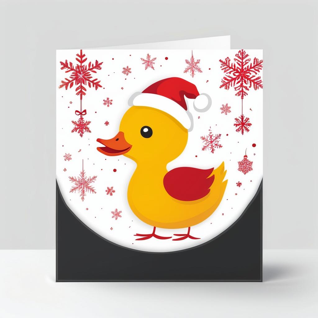 在这幅作品中,我们看到了一个极具现代感的鸭子形象,其简约的线条和鲜明的色彩提供了绝佳的设计基础。尽管画面中缺乏直接的圣诞元素,但通过巧妙的设计,我们可以将其转化为别具一格的圣诞贺卡。首先,可以在鸭子周围添加象征冬季的雪花和温暖的灯光,这不仅丰富了视觉层次,还营造出节日的温馨氛围。红色与黑色的搭配既是经典的现代设计风格,也是圣诞节中常用的色调,通过添加金色的点缀,进一步提升节日感。鸭子底部的红色部分可以被重新构想为礼物盒,赋予其新的节日意义。整体设计的简约风格不仅让人耳目一新,更传达出一种宁静与和平的节日情感。