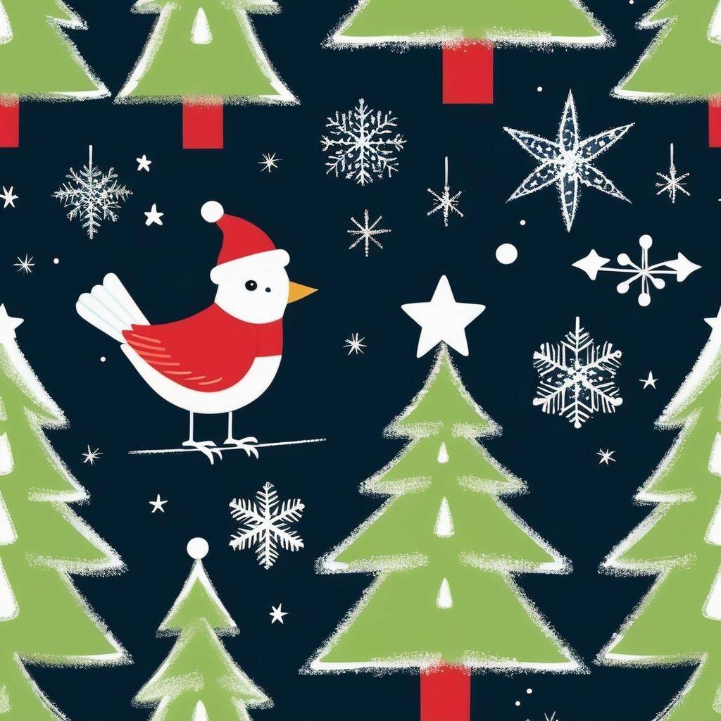 可以将鸟的形象转化为穿着圣诞帽的小鸟,树上添加更多的星星和灯饰以增强节日氛围。背景可以加入柔和的雪花和星光效果,使整幅画面充满温暖的节日气息。