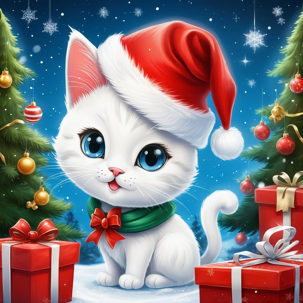 将这只猫咪描绘成圣诞场景中的焦点,例如为猫咪添加一顶红色圣诞帽,并在背景中加入装饰圣诞树和闪烁的灯光。猫咪可以坐在一个雪地上,周围堆放着礼物盒,营造出温馨的节日氛围。使用柔和的蓝色和白色背景,点缀金色和红色的细节,增添节日的喜悦感。