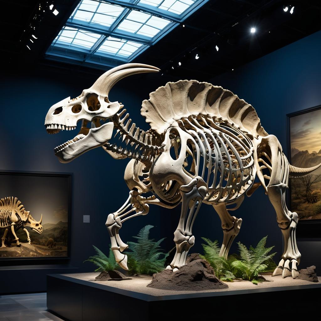 这幅作品展示了一个三角龙的骨架标本,摆放在博物馆的展示柜中。作品的颜色主要是棕色与灰色,突显出骨架的历史感。构图上,骨架呈横向延伸,强调了恐龙身体的长度和体积感。灯光打在标本上,形成了一种神秘而庄重的氛围,似乎在诉说着远古时代的故事。情感表达上,这幅作品唤起了人们对史前生命的敬畏与好奇。