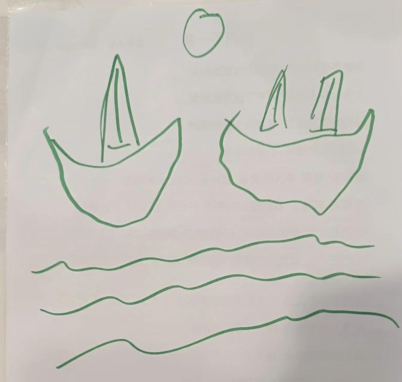 这幅简约的线条画作品,通过简单的绿色线条勾勒出两艘帆船在海面上航行的场景。顶部的圆形可能代表太阳或月亮,为画面增添了一丝神秘感。这种风格让人联想到孩童的艺术作品,充满了天真和直接的美感。画面的简约性也让观众在视觉上感到轻松和愉悦,传达了一种自由和探索的主题。