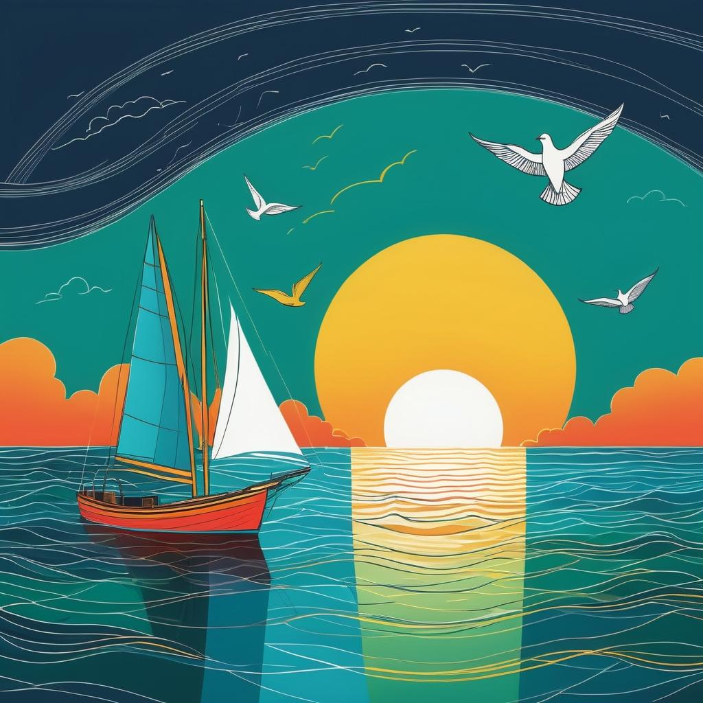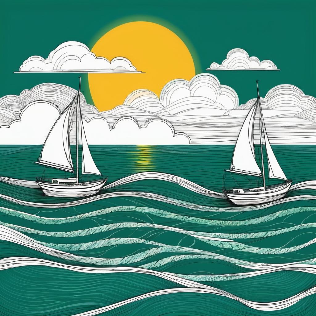 这幅作品采用了简单而现代的线条画风,描绘了两艘帆船在海面上航行的场景。绿色线条勾勒出船只和海浪,顶部有一个简单的圆形代表太阳或月亮。整体给人一种轻松和愉悦的感觉,可能传达了旅行、自由和探索的主题。