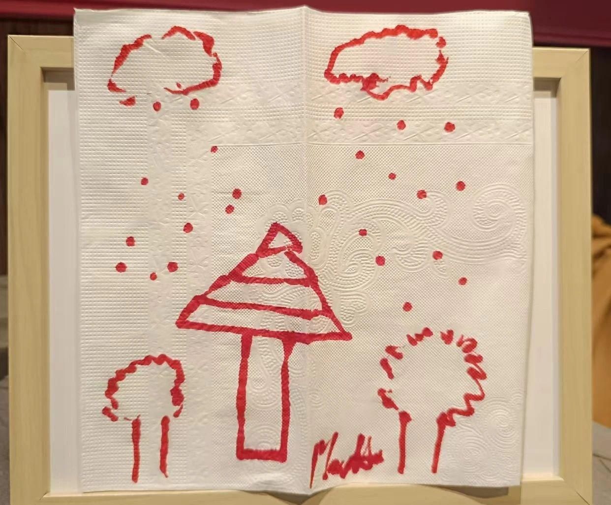 这幅作品以手绘红色线条为主,展示了一个类似圣诞树的图形,背景有云朵和小点,可能代表雪花或装饰。整体风格简洁,但缺乏具体的圣诞元素如圣诞树装饰、灯光或礼物。这幅作品的构图中心是树形图案,采用红色作为主要色彩,具有一定的节日特征。背景的白色纸巾纹理为画面增添了独特的质感。