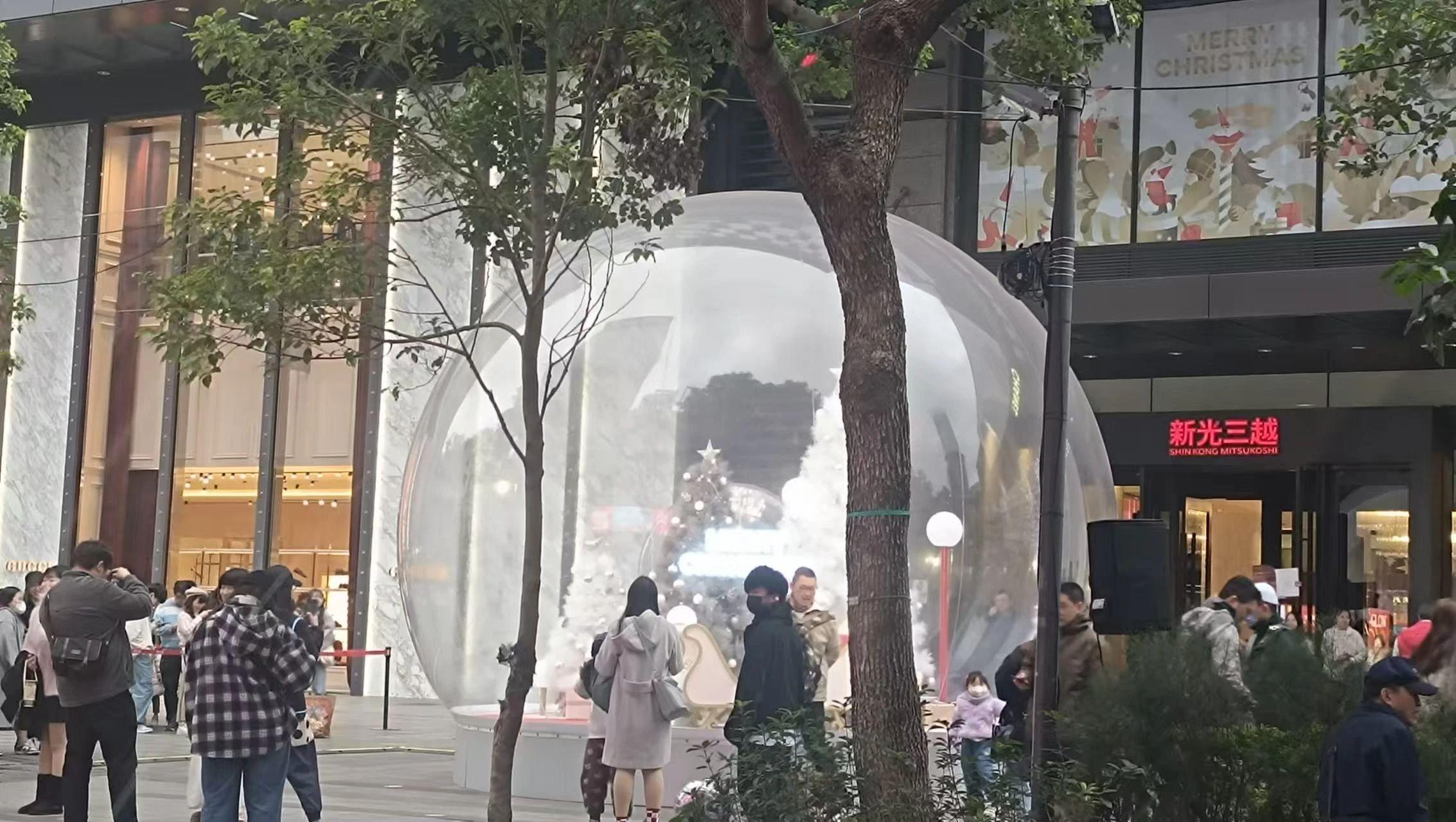 在这幅图片中,我们可以看到一个忙碌的城市街景,其中特别引人注目的是一个大型透明雪球,内含圣诞树和节日装饰。这一元素为圣诞贺卡设计提供了绝佳的灵感。通过将人物姿态和服装细节融入贺卡设计,我们可以创造出一种既个性化又充满节日氛围的作品。为了增强画面的节日感染力,可以在背景中添加更多的闪烁灯光和雪花效果。此外,暖色调的灯光效果能够为整体画面增添温暖与欢乐,完美捕捉圣诞节日的核心情感。这样一张贺卡不仅具有视觉吸引力,更能传递出浓厚的节日情感。