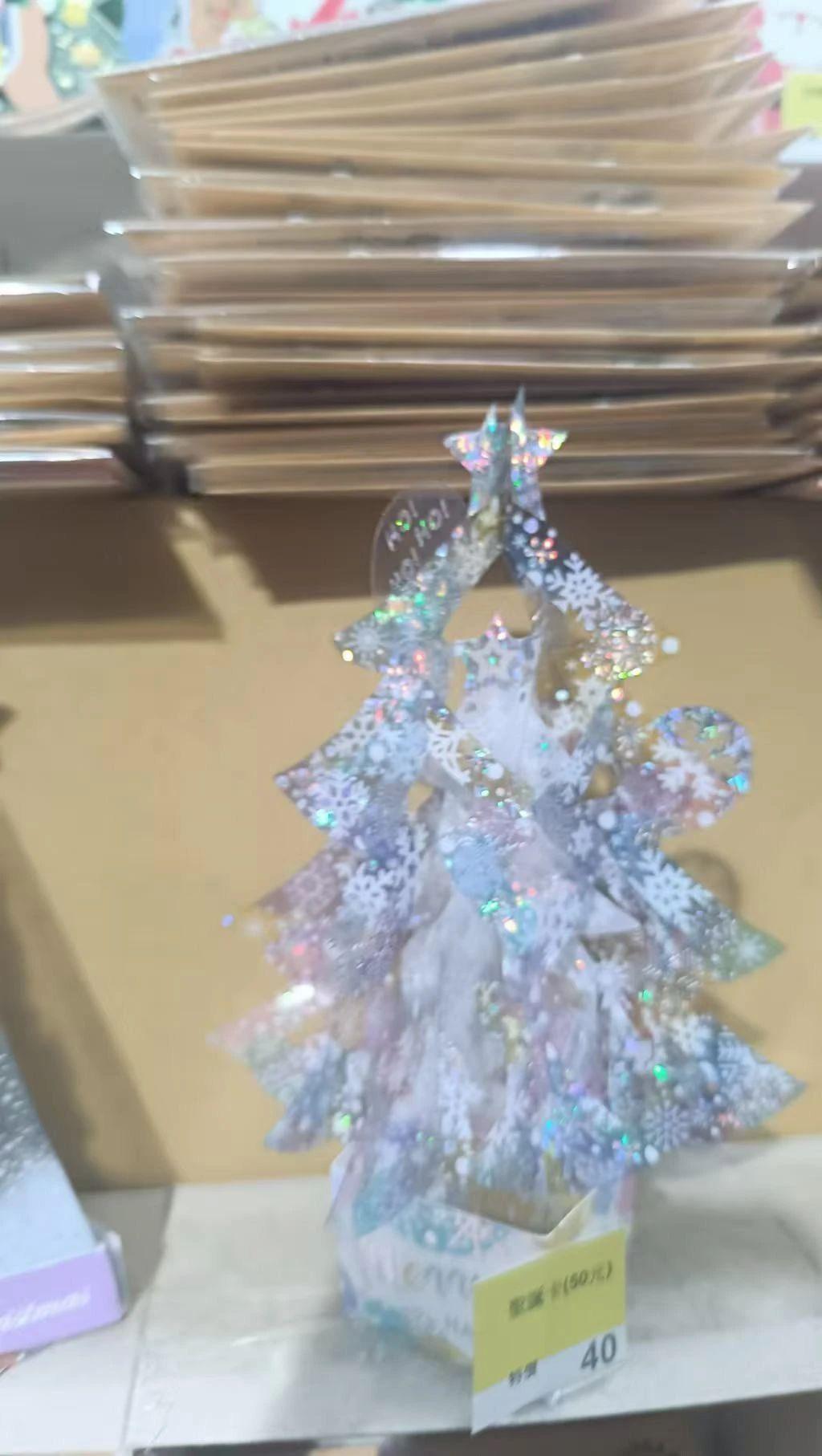 图片中展示了一棵装饰精美的圣诞树,树上点缀着闪亮的装饰物。这棵树位于一个店铺的货架上,背景是一些包装好的纸制品。没有人物出现,重点在于圣诞树的光影效果和装饰的细节。色彩以白色和闪烁的光点为主,可以转化为圣诞贺卡中的核心元素。