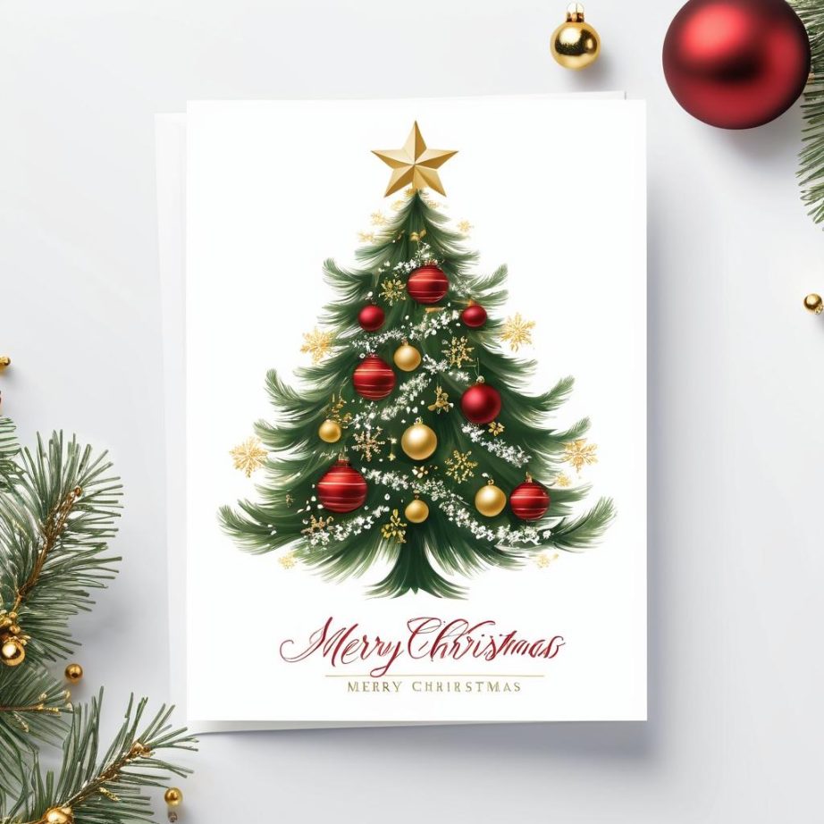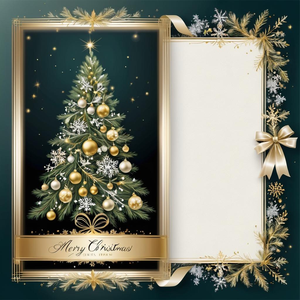 利用这棵装饰精美的圣诞树作为贺卡的中心,添加背景元素如柔和的雪花飘落和温暖的灯光效果,营造出节日的温馨氛围。可以在树周围添加虚拟的小礼物和金色铃铛,增强画面的节日感染力。
