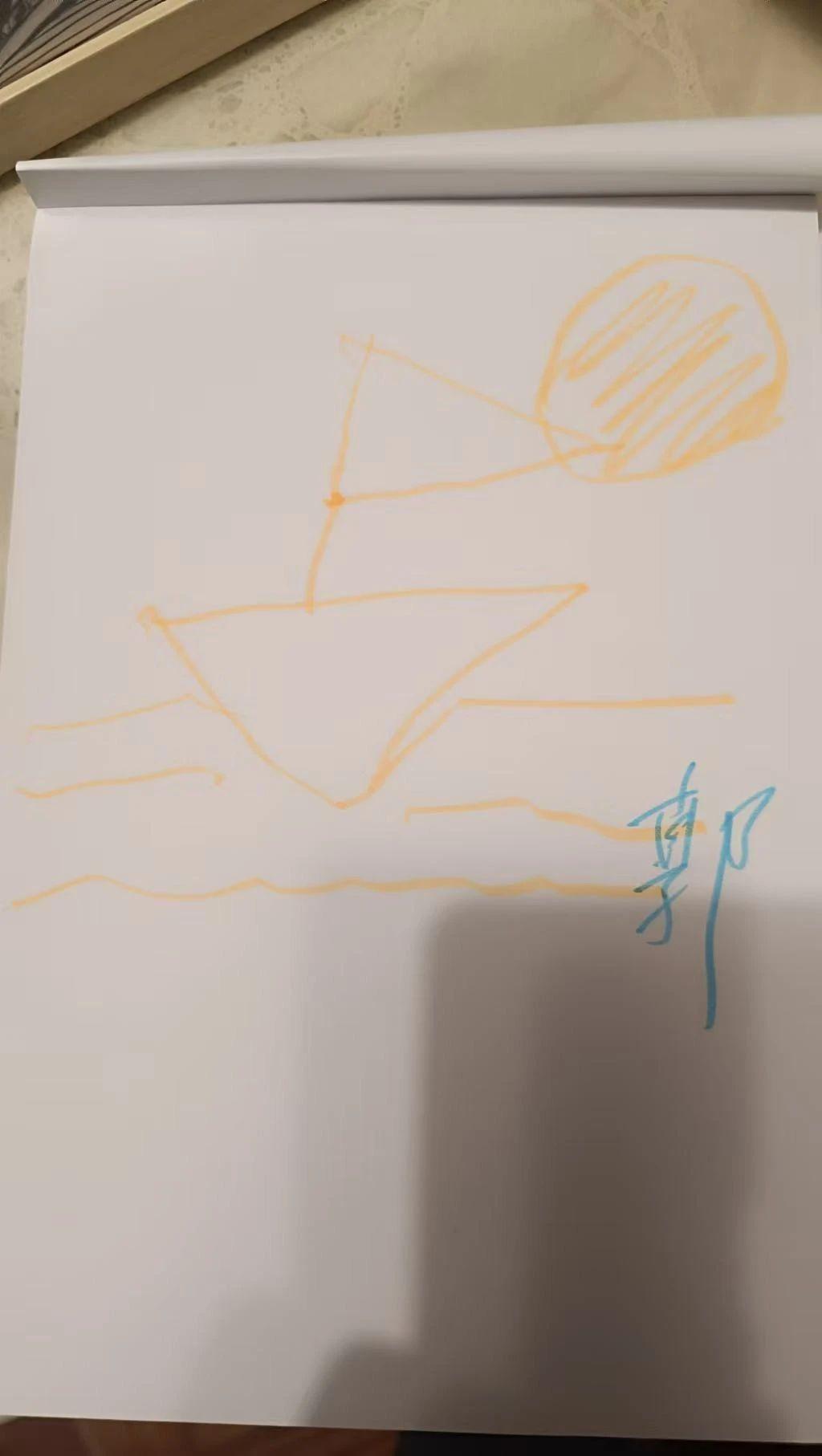 这幅作品以简洁的线条和明亮的颜色展示了一个简单的场景:海面上的一艘船和太阳。橙色的太阳和船只传达了一种温暖、轻松的氛围,而蓝色的签名增添了个性化的元素。整体构图简单明了,给人一种天真和纯粹的感觉。