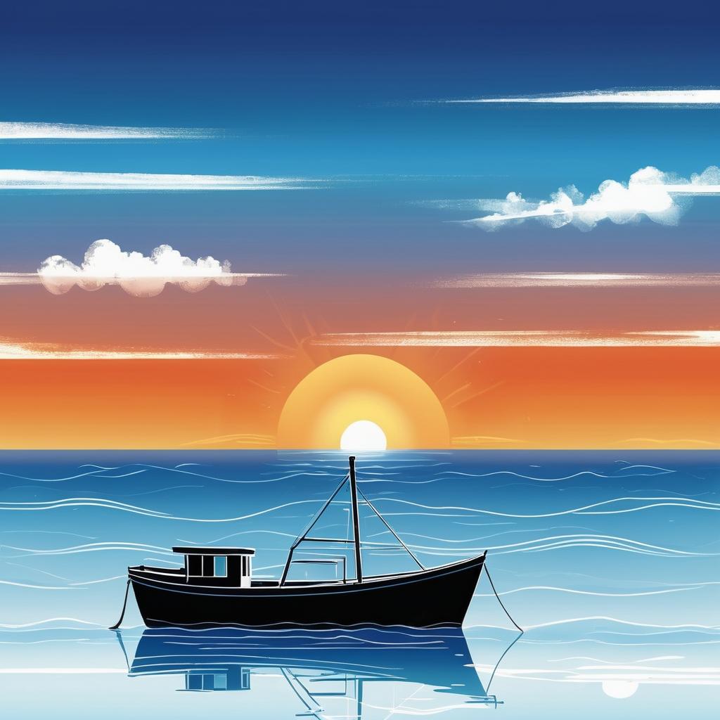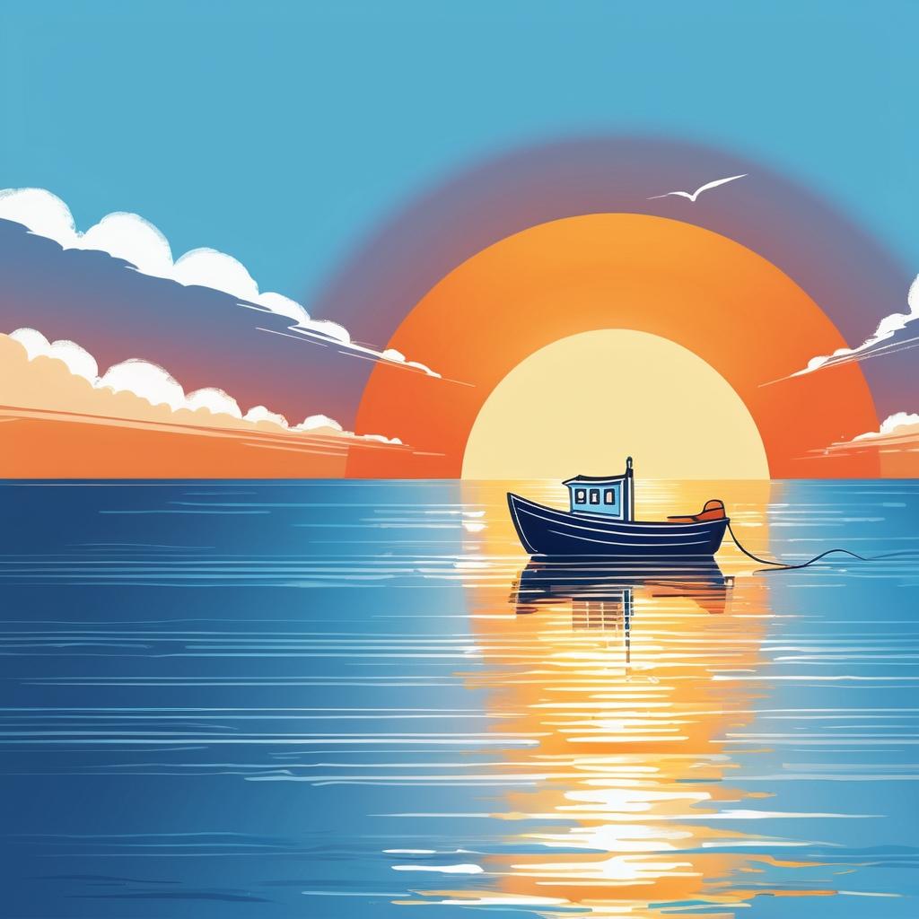 作品的风格接近于天真艺术(Naïve Art),这种风格以其直接、纯粹和富有表现力的特征而闻名。为使这幅作品更具层次感,可以考虑在背景中添加一些细节,如海面的波纹和天空的云彩,进一步丰富画面的故事性和层次感。另外,利用渐变色来强化光影效果,使太阳的光芒更加生动逼真,也可以为作品增添一份动感。