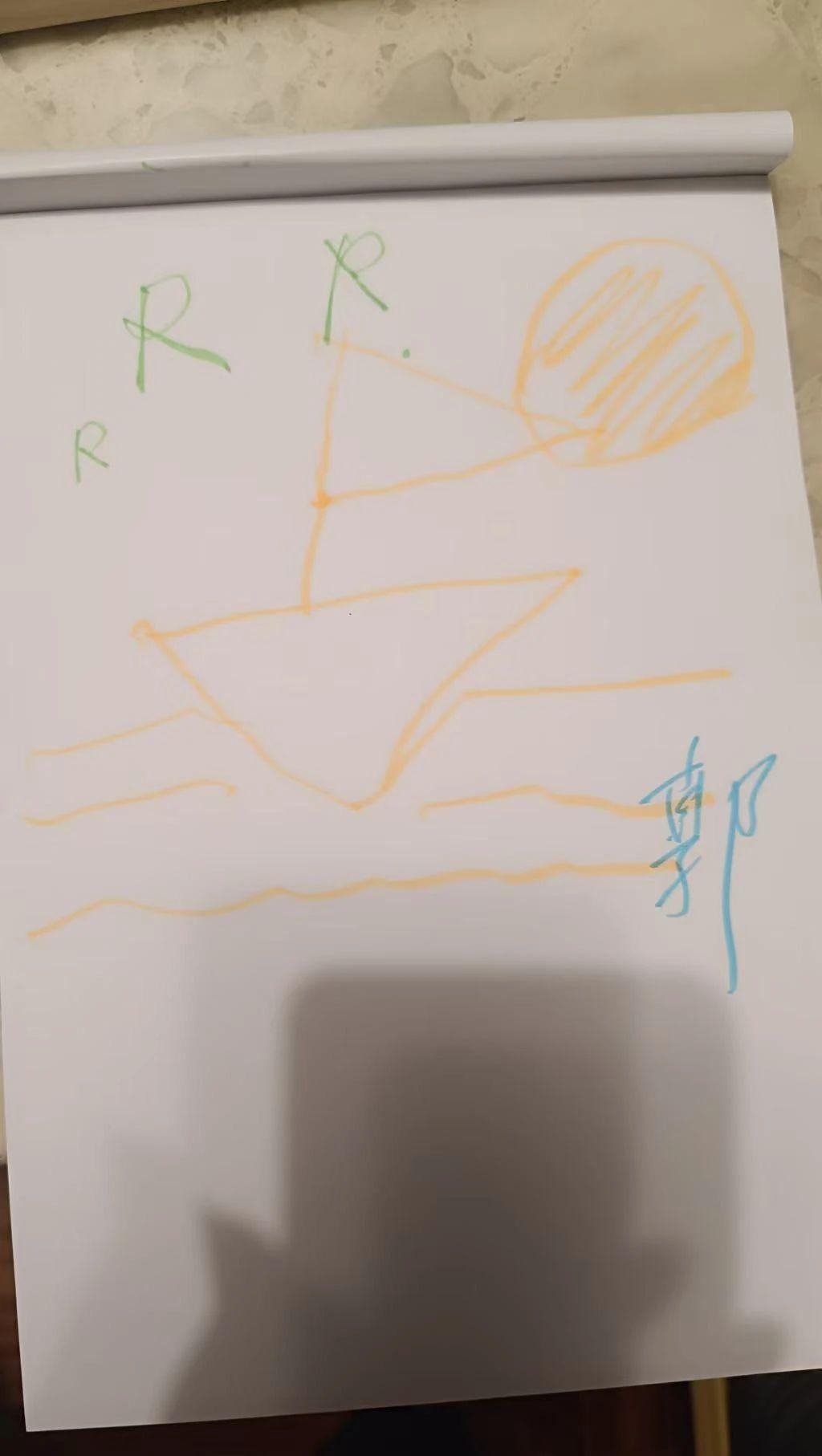 这幅画呈现了一艘船在海上的场景。主要元素包括黄色的船只、太阳和海浪,背景为白色。画面中还出现了一些字母’R’,可能是创作者的签名或其他标记。整体风格简单而富有童趣,色彩对比鲜明。