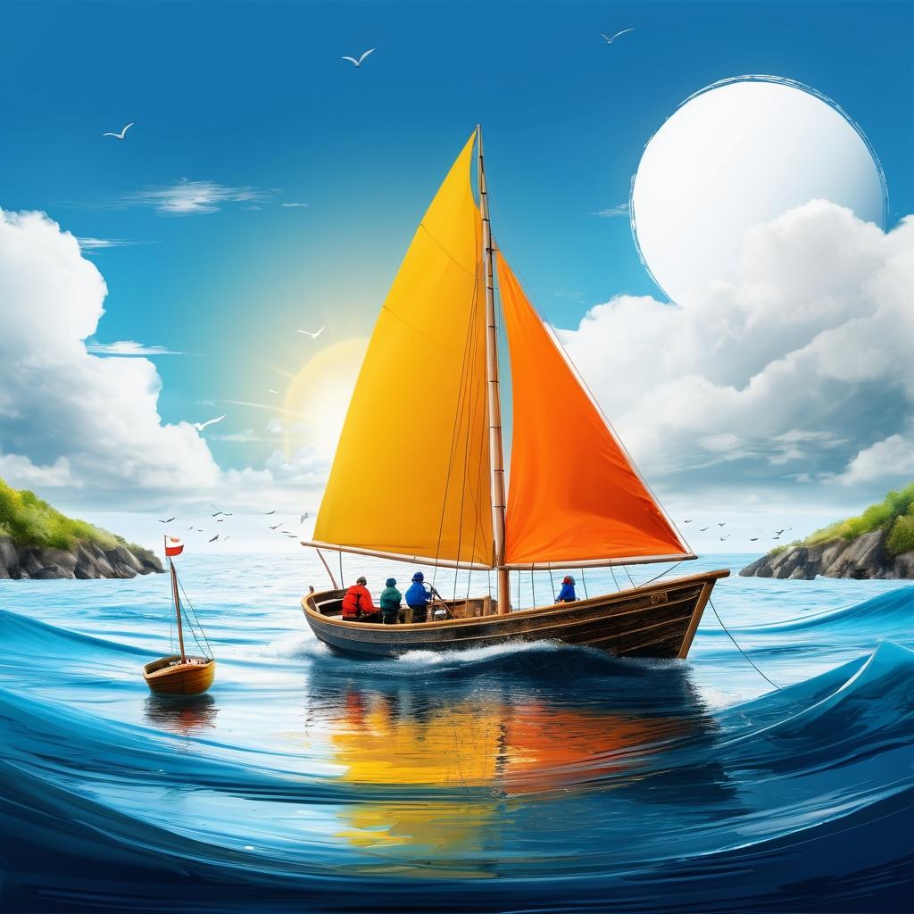 这幅作品展现了孩子对海洋和航海的简单幻想。可以通过增加细节,如波浪的动态变化以及天空的颜色,来增强画面的活力和真实感。引入更多的色彩和纹理,营造出更丰富的视觉体验。通过增加船上的细节,如帆和旗帜,增强故事性,使观者能感受到航行的冒险精神。