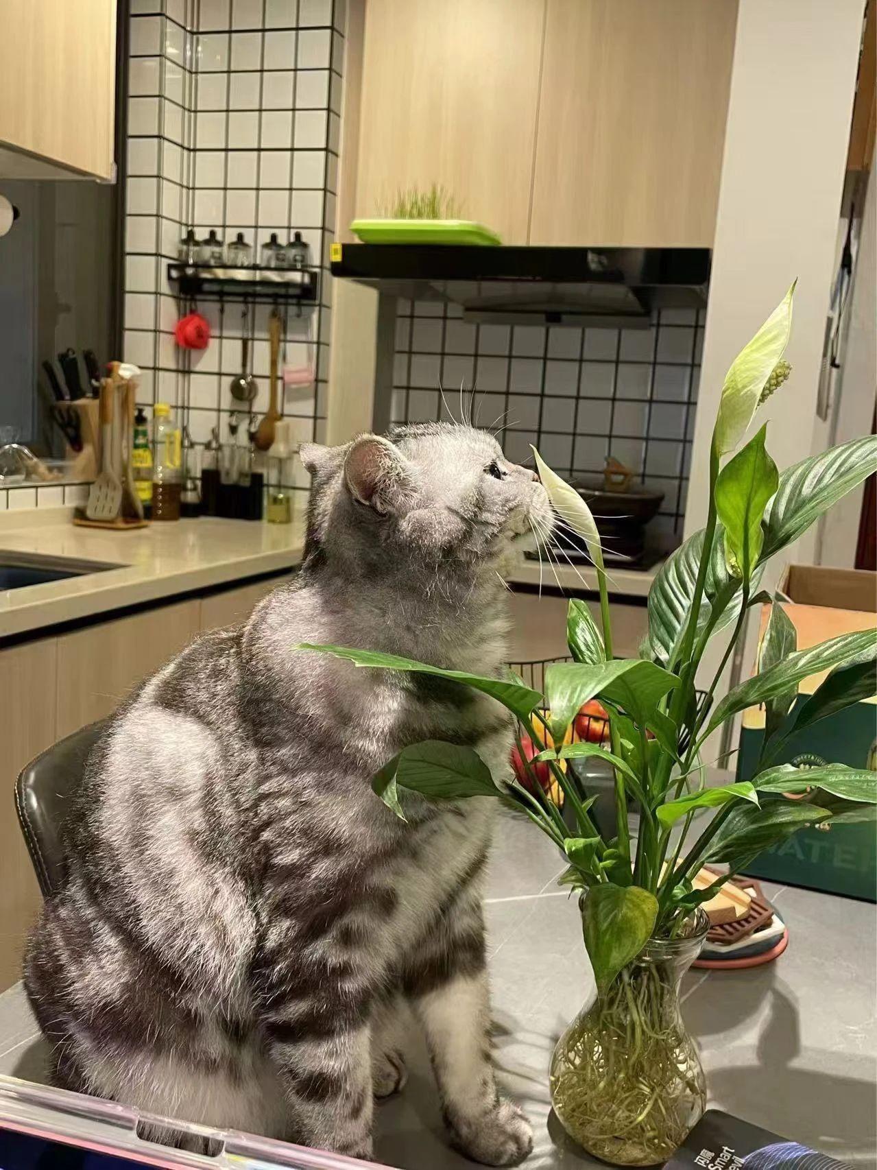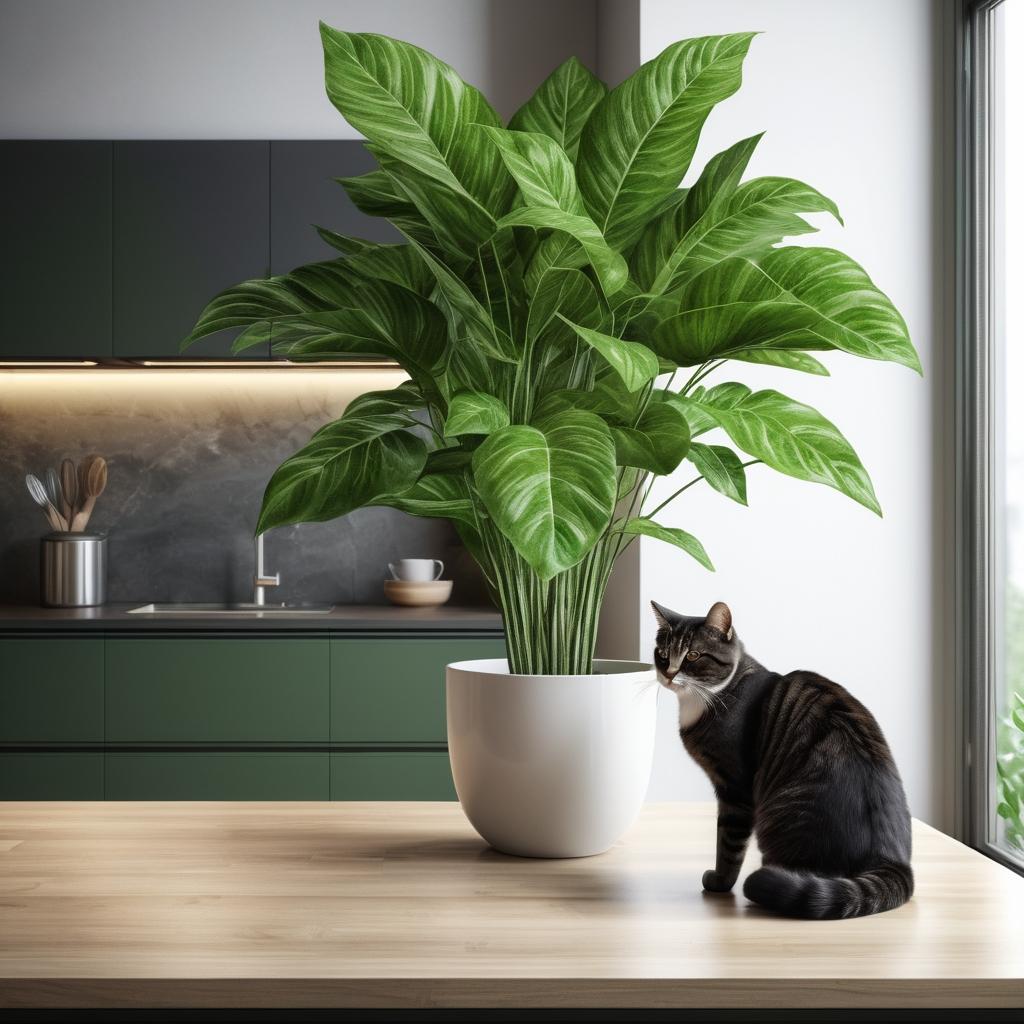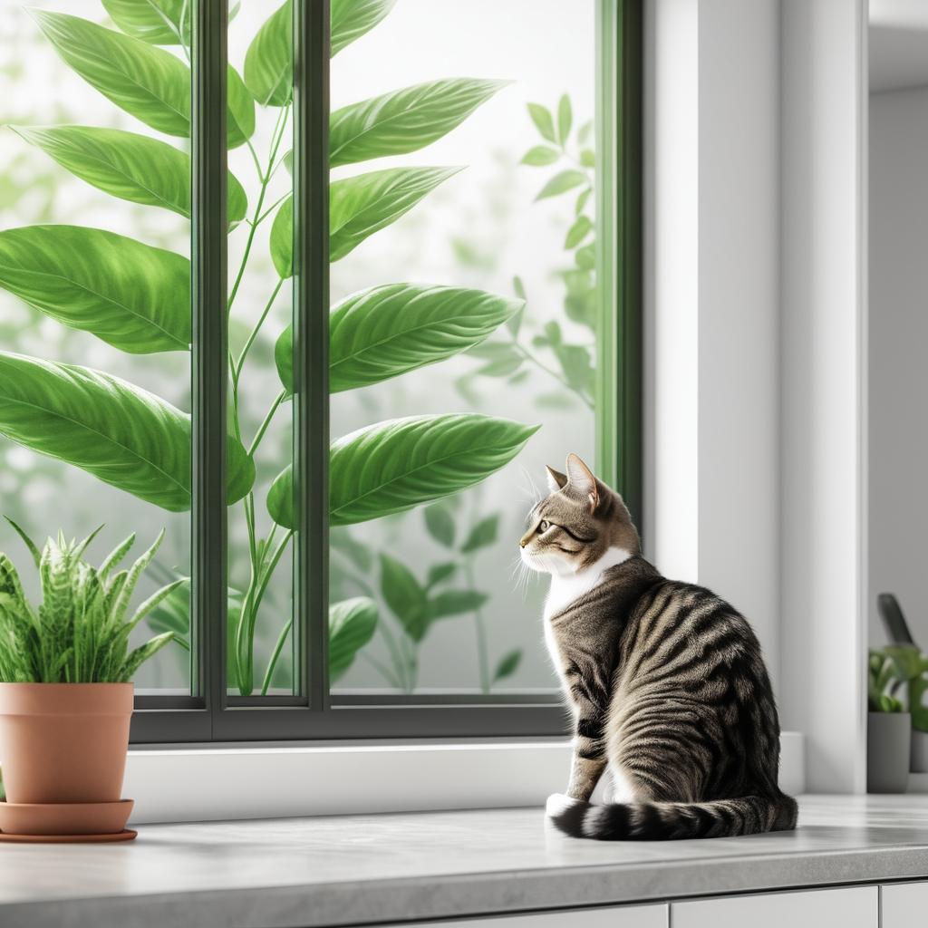 這幅作品展示了一隻貓與一株植物在室內環境中的互動。主要元素包括貓的毛色和植物的綠葉,背景為現代風格的廚房。作品中展現了生活的溫馨和自然的調和,傳達了寧靜與舒適的氛圍。