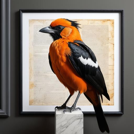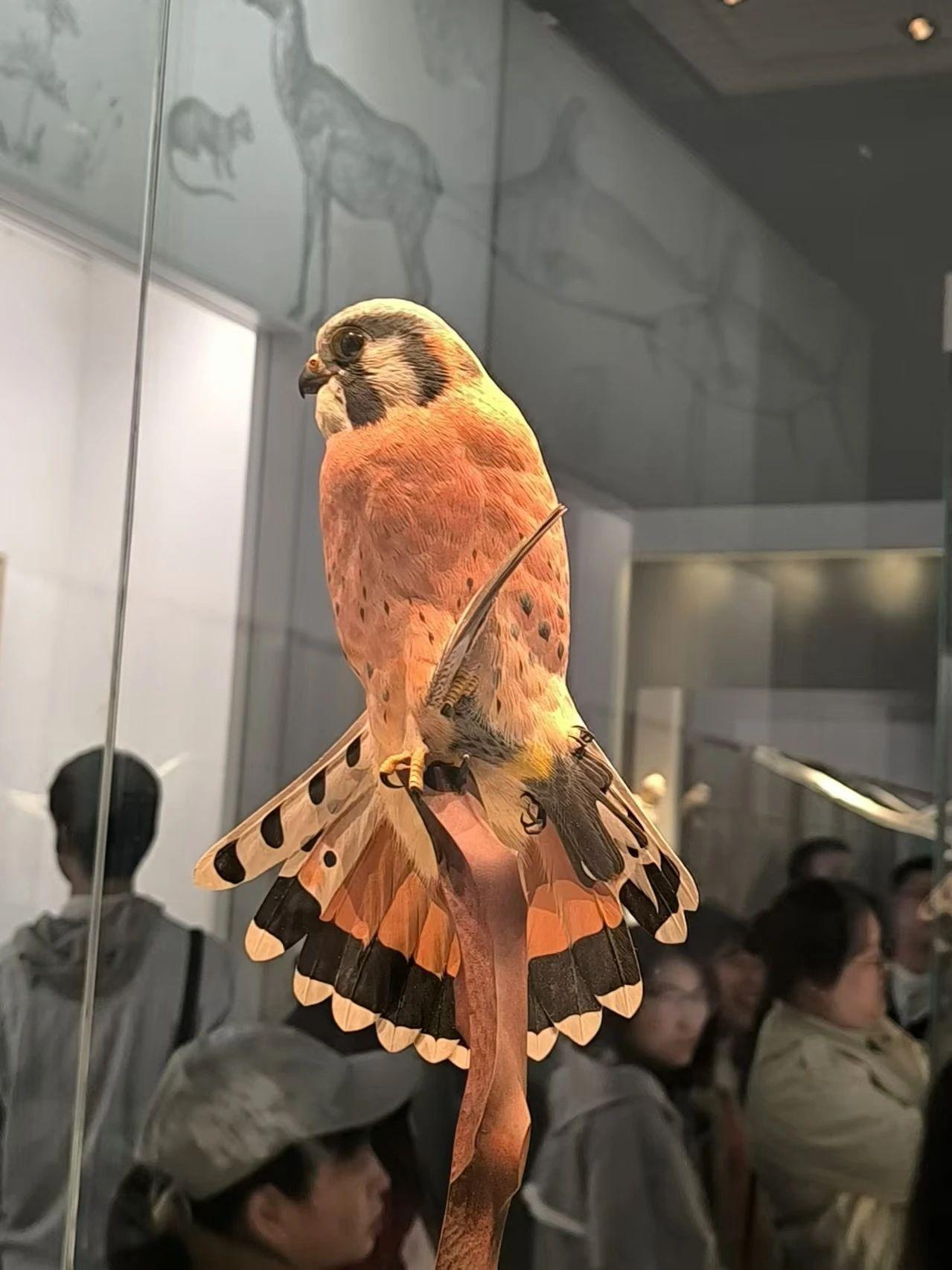 这幅作品以一只色彩鲜艳的鸟为主体,背景是一个博物馆环境,墙上有动物的素描。鸟的色彩非常丰富,橙色、黑色和白色的羽毛形成鲜明对比,吸引观众的目光。画作传达了一种自然与文明交融的主题,似乎在探讨人类与自然的关系。