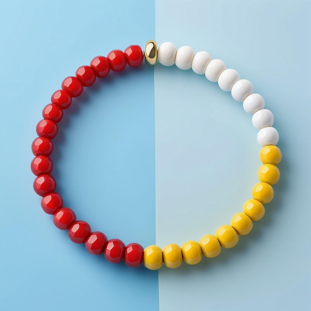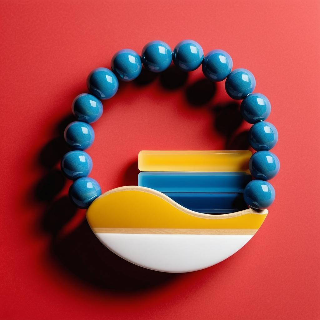 从船的简约形态中汲取灵感,设计一款极简风格的串珠手链。通过几何形状的珠子,如椭圆形和三角形,体现船体和帆的设计元素。使用蓝色、黄色和红色的渐变色调珠子,重现海洋和日出的色彩。
