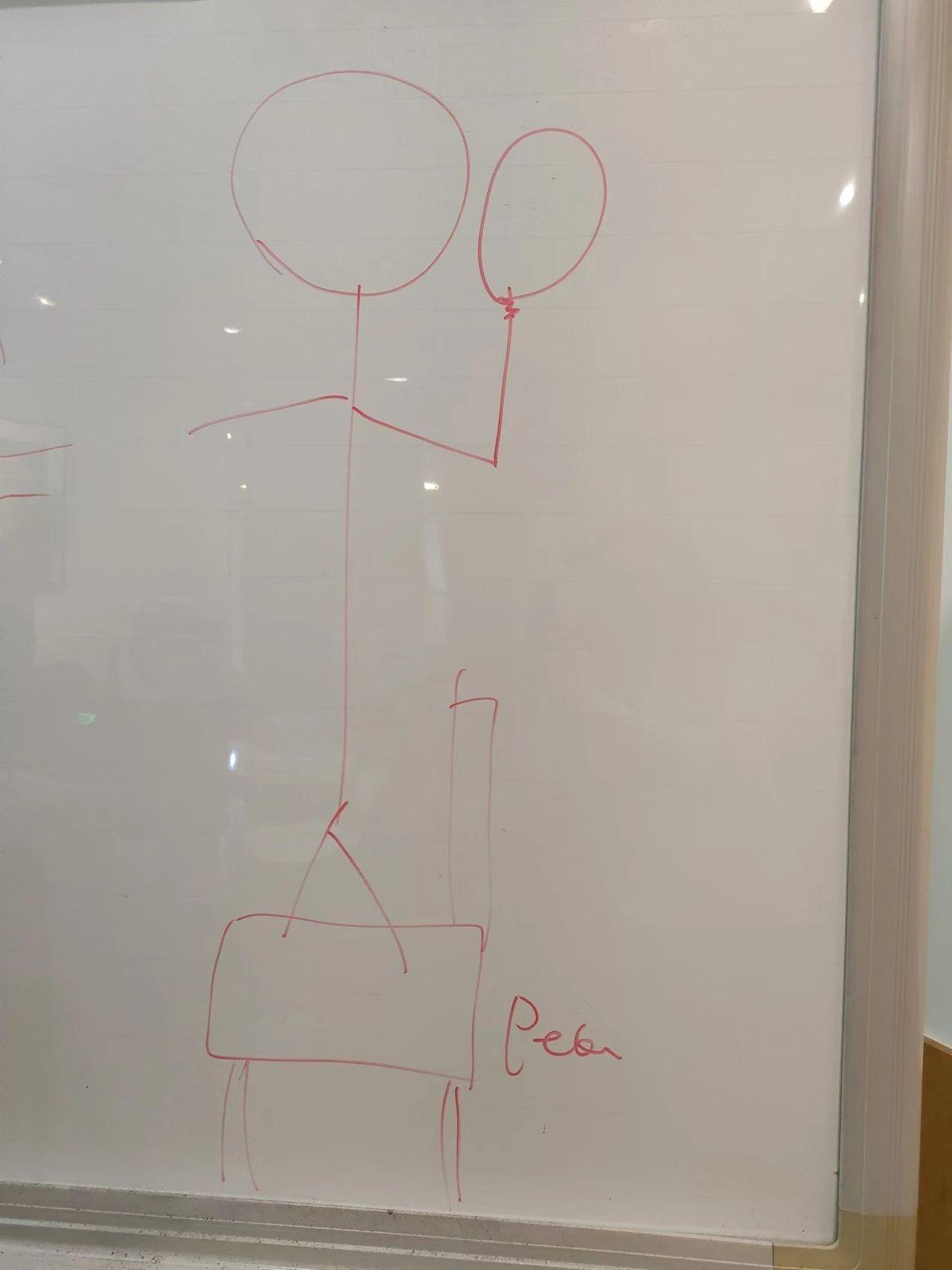 这幅画展示了一个用简单线条绘制的火柴人,站在一个矩形形状上,手中拿着一个椭圆形物体。画面简洁,线条流畅,显示出一种轻松幽默的风格。整个作品让人联想到孩童的涂鸦创作,传达出一种纯真和创造力的情感。