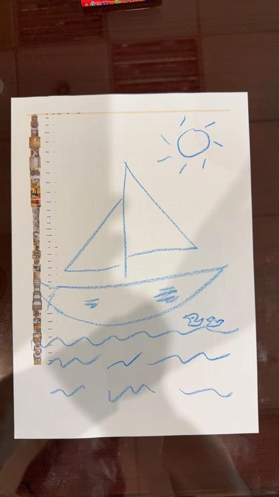 这幅作品使用蓝色蜡笔简单勾勒出一艘帆船,水波,太阳和两只小鸟,展现了一种轻松愉快的海上风景。构图简洁,色彩单一,表现出一种童趣和纯真。创作者可能试图传达一种自由和宁静的感受。