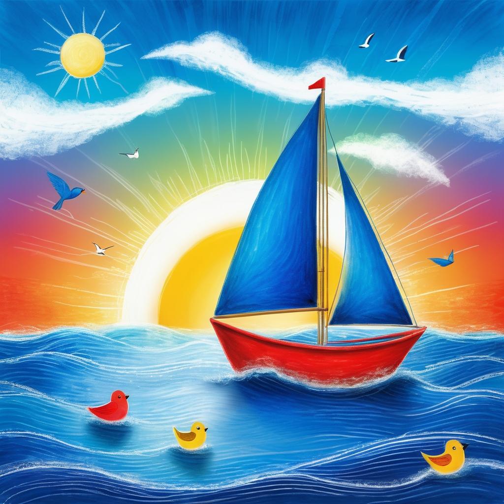 这幅作品以简单的线条和形状捕捉到了大海的宁静和自由,具有一种儿童般的天真和纯粹。这种风格让人联想到无忧无虑的童年时光,是一种纯粹的情感表达。为了提升这幅作品,可以考虑增加更多的细节和色彩,例如在海面上添加反光效果,或是在天空中加入更多的云朵以丰富画面的层次。通过在背景中融入渐变色调,可以增加作品的深度和视觉冲击力。此外,引入一些对比色,例如暖色调的天空或海面上的金色反光,可以使作品更具吸引力。