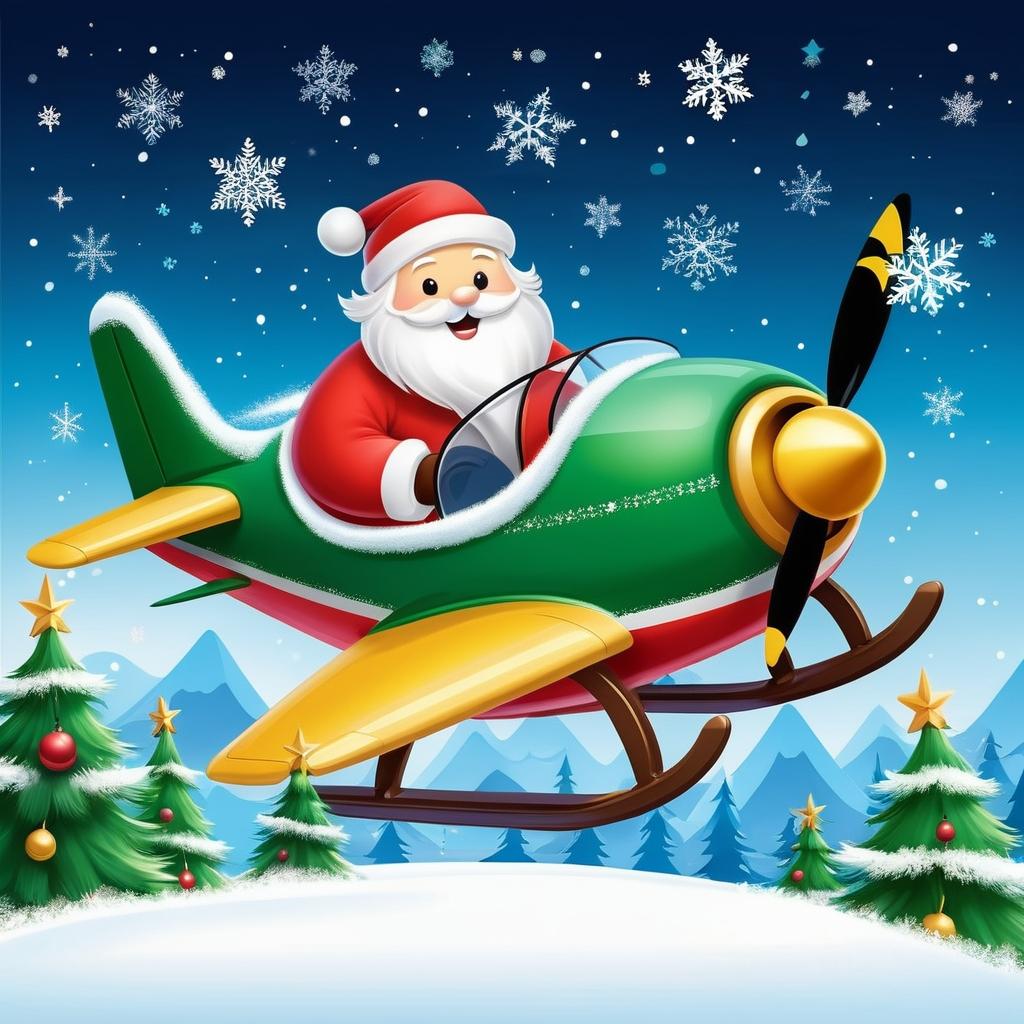 利用飞机上的卡通角色作为贺卡的主要视觉元素,结合圣诞节的红、绿、金色调。可以在卡通角色周围添加圣诞元素,如小型圣诞树、雪花和彩灯,使其仿佛在进行节日庆祝。背景可加入柔和的雪景效果,营造温馨的节日气氛。