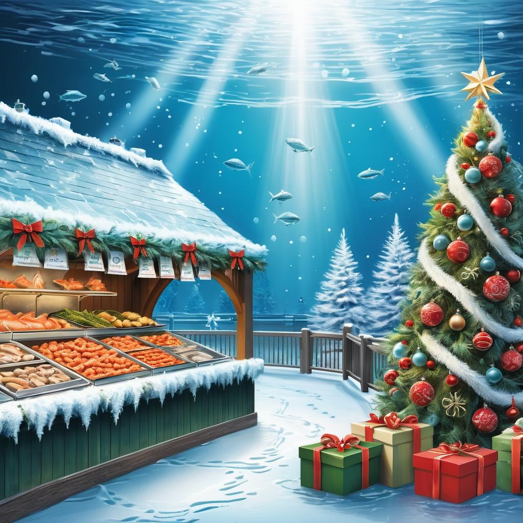 这幅作品展示了一个海鲜市场的场景,主要元素为整齐排列的鱼类和贝类,放置在冰块上。墙上有一个醒目的品牌标志,整体色调偏冷,光线较为明亮。图片中缺乏直接的节日元素及人物,但可以利用冰块的质感和鱼类的排列方式来营造冬季和圣诞氛围。色彩上,金属色调的墙壁和冰块提供了一个可以与圣诞元素如红色和绿色进行对比的背景。