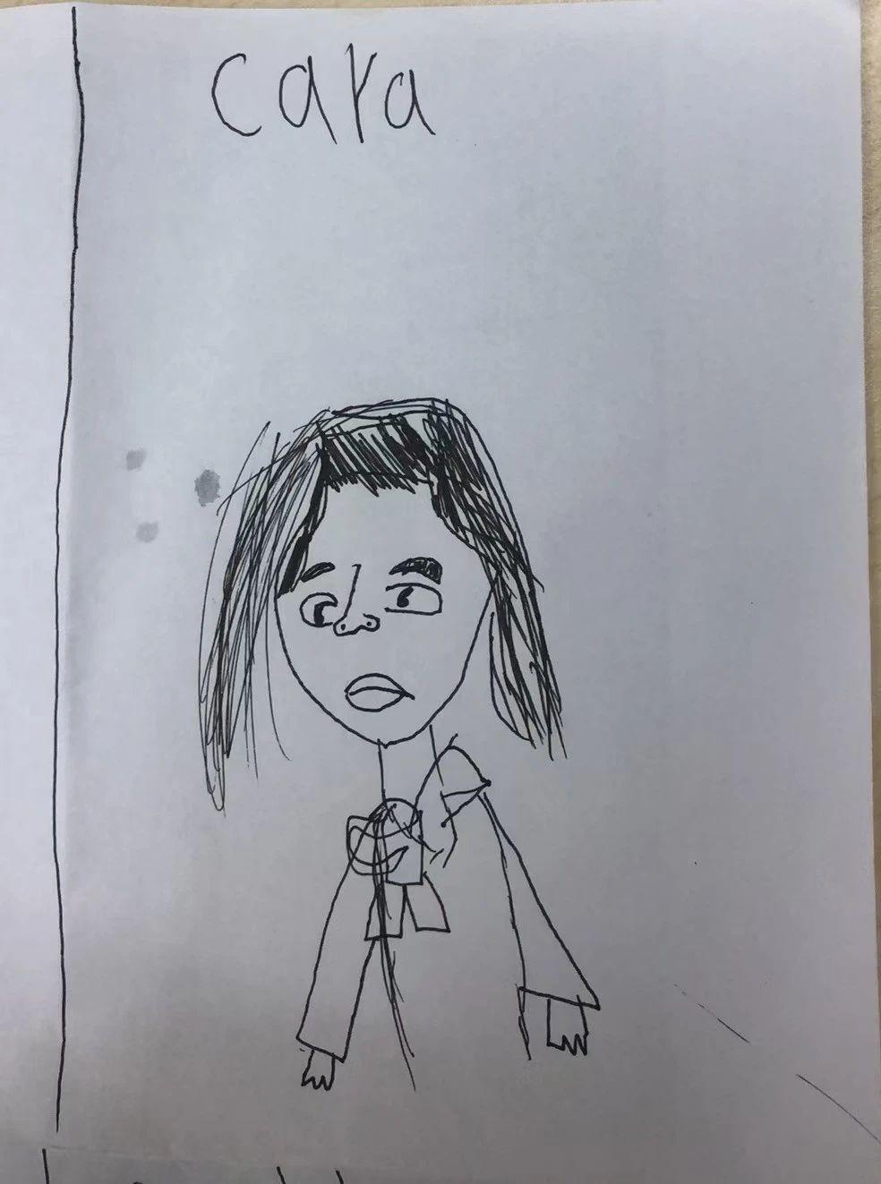 这幅作品是一幅简单的线条素描,描绘了一个人物形象。使用了黑色墨水线条,整体风格朴素而直接。人物的五官和发型简单勾勒,具有一定的儿童画风格,展现了天真和直接的情感表达。画面以白色背景为主,突出了线条的表现力。