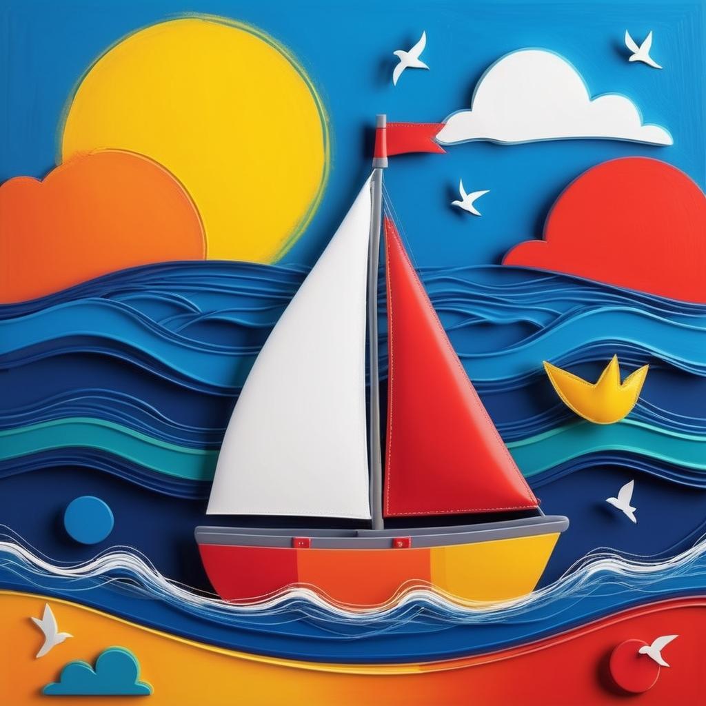 儿童绘画常常以其简单的线条和丰富的想象力吸引着观众。这幅作品通过一艘帆船和几何图案传达了探索的主题。黄色的背景和简单的色调使画面显得轻松而愉快,仿佛在邀请观众进入一个充满冒险的世界。儿童的作品通常不拘泥于现实,正如画中的小V字形符号和波浪线,它们可以是海鸥、海浪或任何孩子想象中的元素。增加细节如海洋背景或渐变色调,可以使画面更富有层次感和故事性。这样的作品不仅可以激发孩子对世界的好奇,也能让成人重新发现简单和纯真的美。