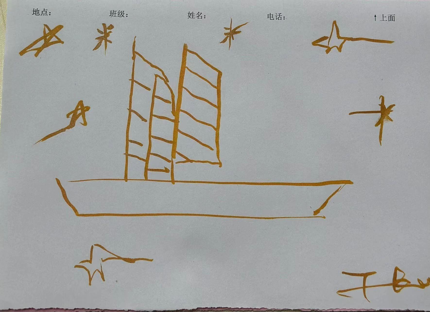 这幅画作通过简单的线条和图形,生动地展现了一个童真的航海梦。画中的帆船以简洁的线条勾勒,周围的星星则散布在白色背景上,形成了一个充满想象力的开放空间。这样的构图不仅展现了创作者的自由和开放思维,也反映了孩子们对探索和冒险的渴望。