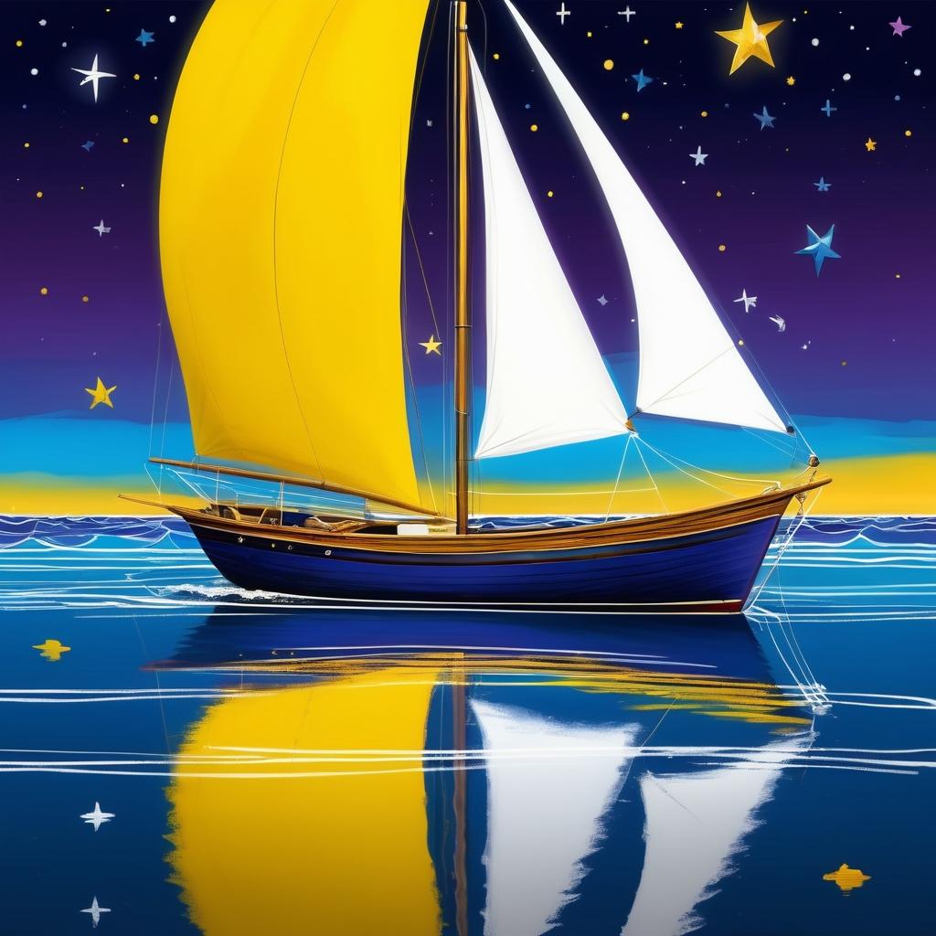 这幅作品的核心是其纯粹的表达与想象力的体现。为增强其视觉冲击力,可以考虑在背景中添加更多层次的色彩,比如渐变的蓝色和紫色以模拟夜空的效果,进一步突出星星的存在。同时,船体的描绘可以加入更细致的线条和阴影,增强其立体感。可以在船的周围加入一些海洋元素,如波浪或海鸟,以丰富画面的故事性。这样的处理不仅能保持作品的简单和纯粹,还能赋予其更深的艺术表现力和视觉吸引力。