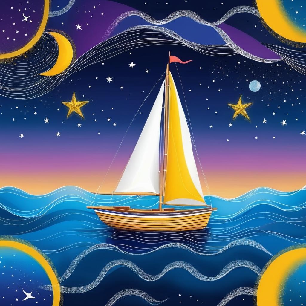 在创作过程中,使用了深黄色或金色的线条,这种颜色选择不仅增加了画面的视觉冲击力,也为作品增添了一种温暖和活泼的氛围。尽管画面简单,但却充满了丰富的情感表达。为了进一步提升作品的艺术性,可以在背景中加入渐变的蓝色和紫色,以模拟夜空效果,使星星更加突出。同时,船体可以通过更细致的线条和阴影处理来增强立体感。此外,在船的周围加入一些海洋元素,如波浪或海鸟,不仅丰富了画面的内容,也为作品增添了更多故事性。