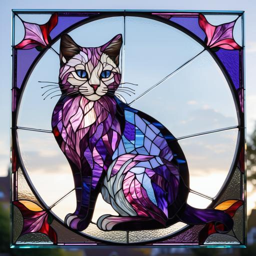 在这幅作品中,彩色玻璃的艺术被完美地呈现出来。主体是一只猫,采用了柔和的粉色和紫色调,给人一种宁静而梦幻的感觉。这种色彩的选择不仅增加了视觉上的吸引力,也传达出一种优雅的氛围。通过几何分割的设计,作品展现出类似马赛克的视觉效果,增强了作品的趣味性和复杂性。