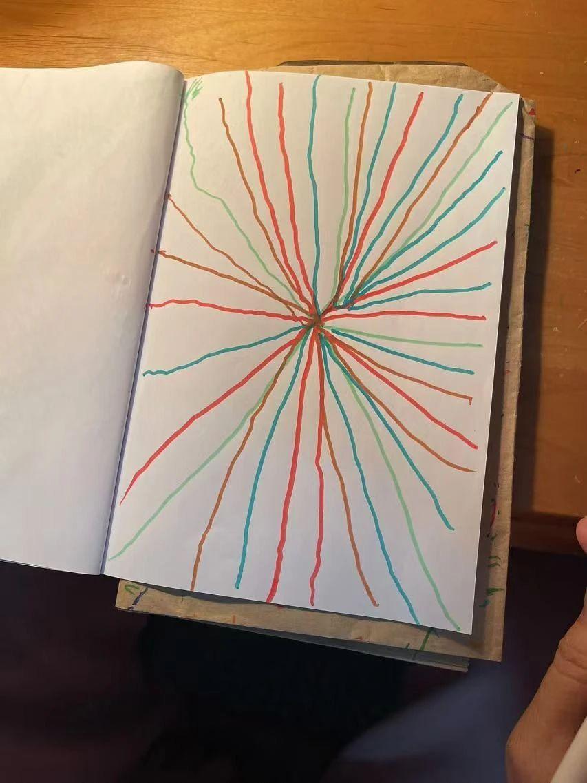 这幅图的中心呈现出辐射状的彩色线条,红、绿、蓝等颜色交错排列,形成向外扩散的动态效果。线条的均匀排列与色彩的对比,赋予画面一种活泼的情绪表达,似乎象征着能量的释放与扩展。