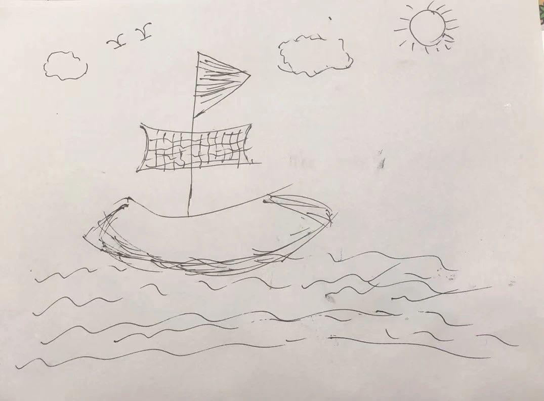 这幅作品通过简单的线条和基本的形状捕捉了一种纯粹的童趣。为了提升这幅作品,可以考虑增加更多的细节和色彩,使其更具视觉吸引力。例如,添加一些色彩丰富的背景,或者在船上添加一些精致的细节,如船帆上的图案或船体的纹理。可以通过使用水彩或蜡笔的方式来增加作品的色彩层次,使其在视觉上更具深度和立体感。此外,增强天空和海洋的对比度,使船在画面中更为突出,强化航行的主题。