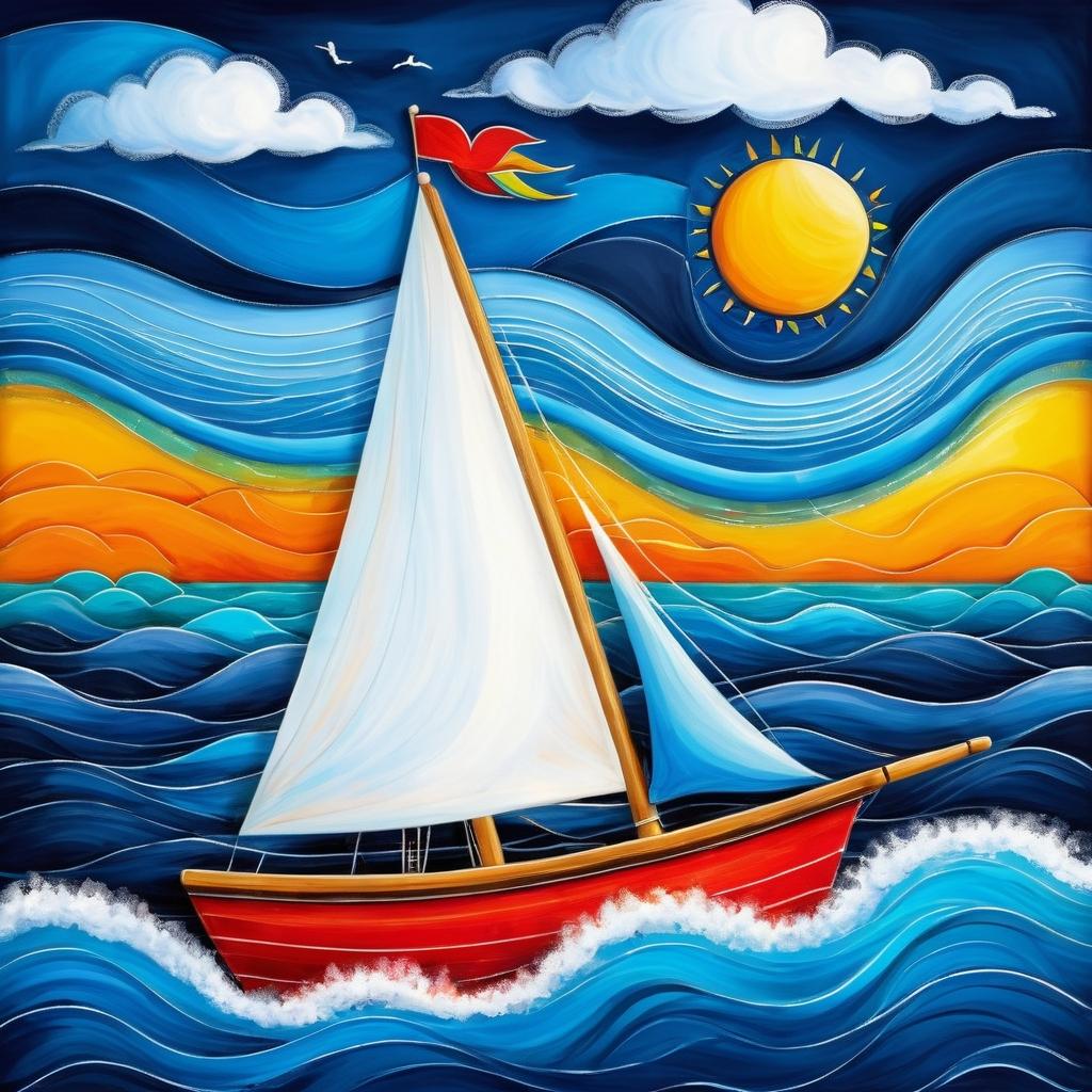 这幅简单而富有童趣的帆船画作,通过简单的线条和基本形状,传达出一种轻松愉快的感觉。画中元素如太阳、云朵、飞鸟和波浪构成了一个充满童真和幻想的世界。这样的作品常常让人联想到无忧无虑的童年时光,以及对大海和航行的浪漫憧憬。艺术家通过这种方式表达了自由和冒险的主题。为了进一步提升这幅作品的艺术性,可以考虑增加色彩的运用,使画面更加丰富多彩。通过使用水彩或蜡笔,不仅可以增强作品的视觉吸引力,还能进一步突出帆船在海面上航行的冒险精神。此外,增加船帆上的图案和船体的细节纹理,也能够使画面更具层次感和立体感。这样的创作不仅仅是对儿童视角的再现,更是一种通过简约手法表达深刻主题的艺术尝试。这种风格与20世纪著名艺术家保罗·克利的作品有一些相似之处,他的作品常常通过简单的形式和鲜艳的色彩来表达复杂的情感和主题。