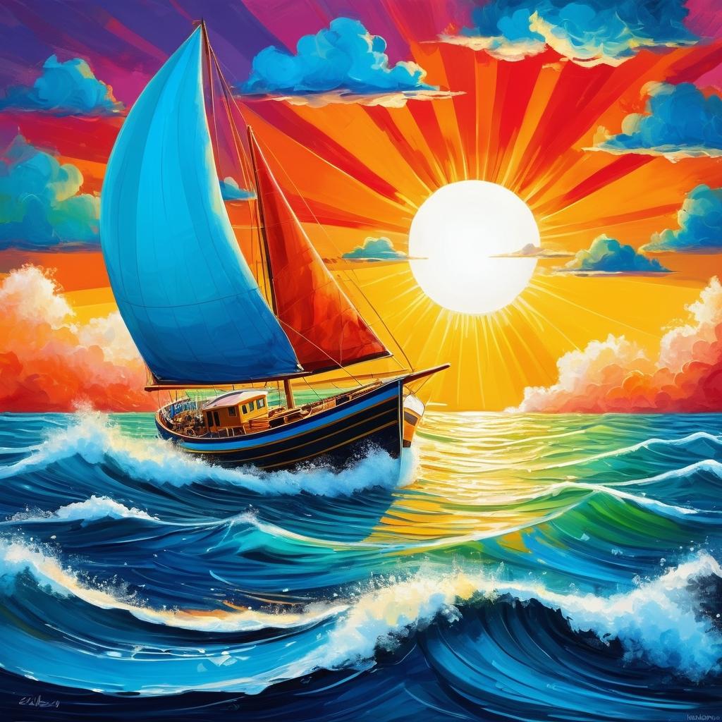 这幅作品是一幅简单的线条画,描绘了一艘在海上航行的帆船。画中元素包括太阳、云朵、飞鸟以及波浪,整体构图简单质朴,给人一种轻松愉快的感觉。这种画风通常传达一种天真无邪的童趣,可能意在表达自由与冒险的主题。