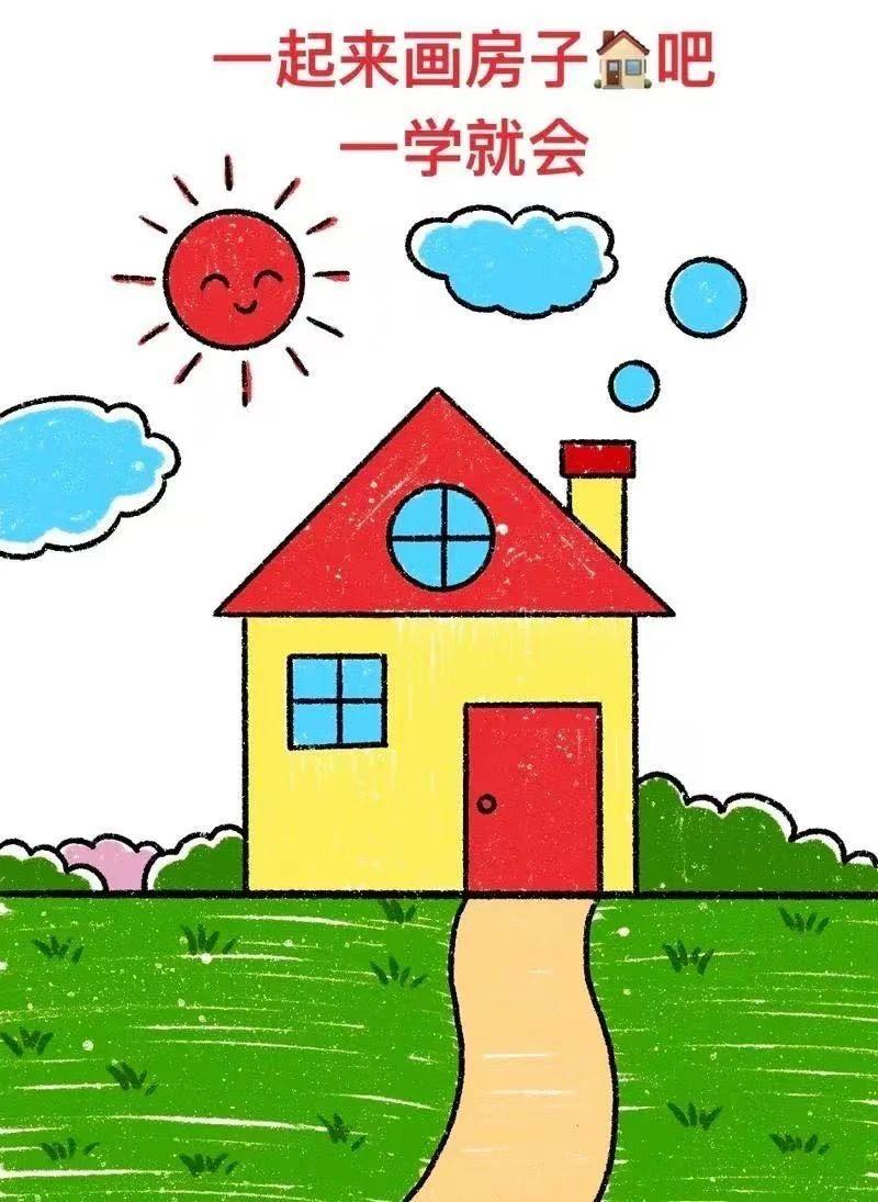 这幅插画展示了一个简单而富有童趣的场景:一座红顶黄墙的房子、一条小路、绿草地、蓝天上的白云和一个微笑的太阳。具象物体包括房子、太阳、云朵和草地,颜色鲜艳,线条简洁,呈现了和谐的氛围。这些元素共同构成了一个温馨的家庭场景,象征着快乐和宁静。