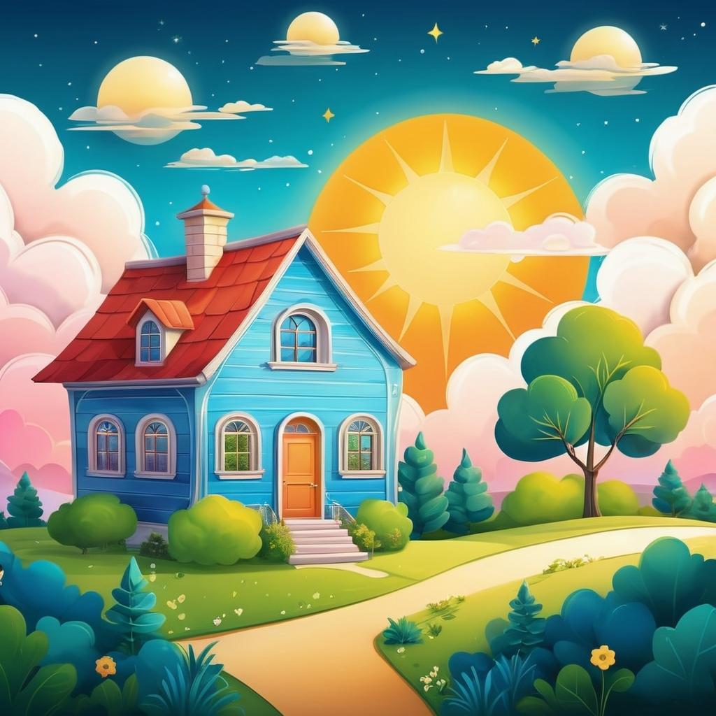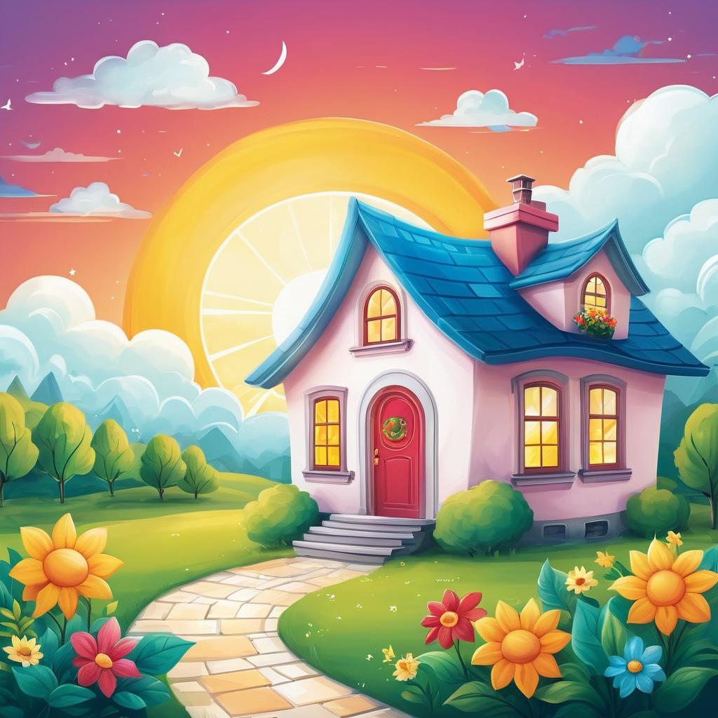 这幅插画通过简单而富有童趣的元素,成功营造了一个充满温馨和快乐的场景。房子、太阳、云朵和草地等具象物体以简单的线条和鲜艳的色彩展现,传达出一种明快和谐的氛围。通过拟人化处理,这些元素可以进一步增强画面的叙事性,例如让太阳与房子互动,增添趣味性和故事感。在创作时,通过细致的光影变化和色彩搭配,增加插画的视觉吸引力和艺术表现力,使之成为一幅引人入胜的儿童插画。