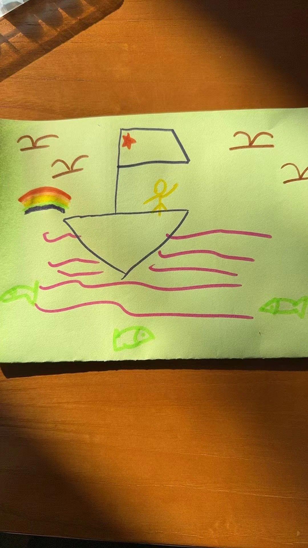这幅图展示了一艘简单的船,船上有一个小人和一面旗帜,旗帜上有一颗星星。背景有彩虹、飞鸟和鱼。具象物体包括船、人、鱼和鸟,它们的颜色鲜艳且线条简单。虚构物体如彩虹和星星旗帜增添了幻想的元素。整体色彩鲜明,具象与虚构的结合让人联想到冒险与自由。