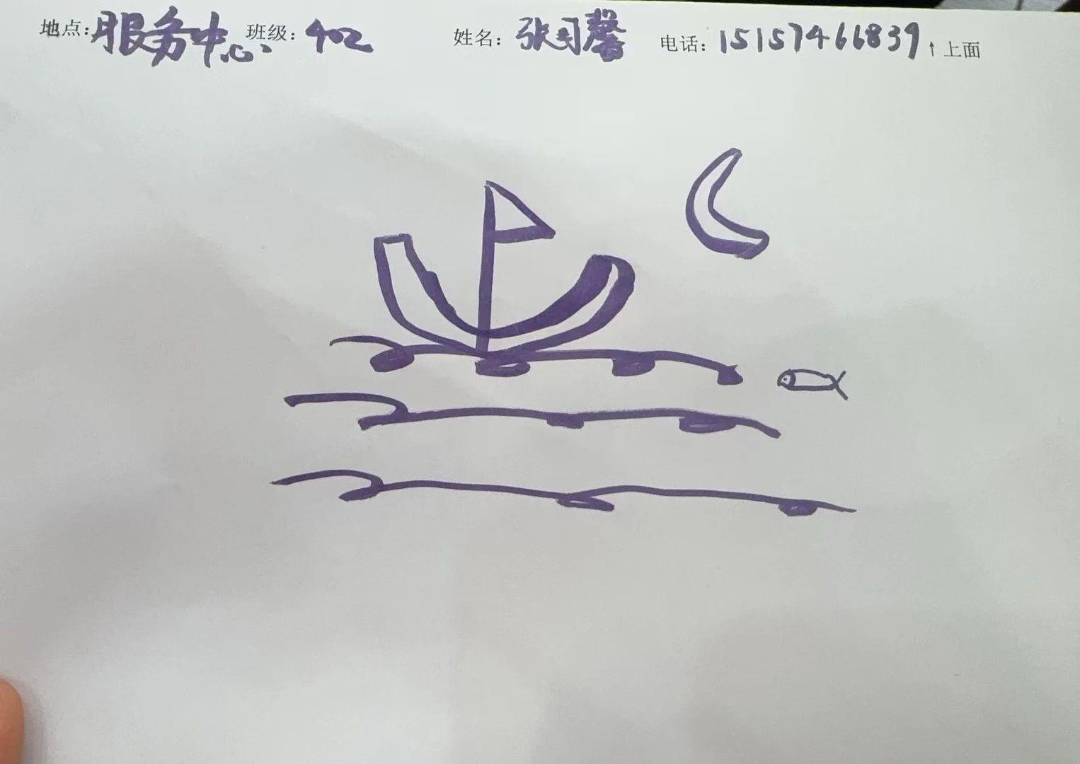 这幅插画中包含简单的具象物体:一艘船、一条鱼、月亮和水波。船的形状简洁,呈现出一种抽象的形式感,水波则以曲线表现出动感。月亮在天空中增添了一种宁静的夜晚氛围。鱼的存在为画面增添了生动的细节。