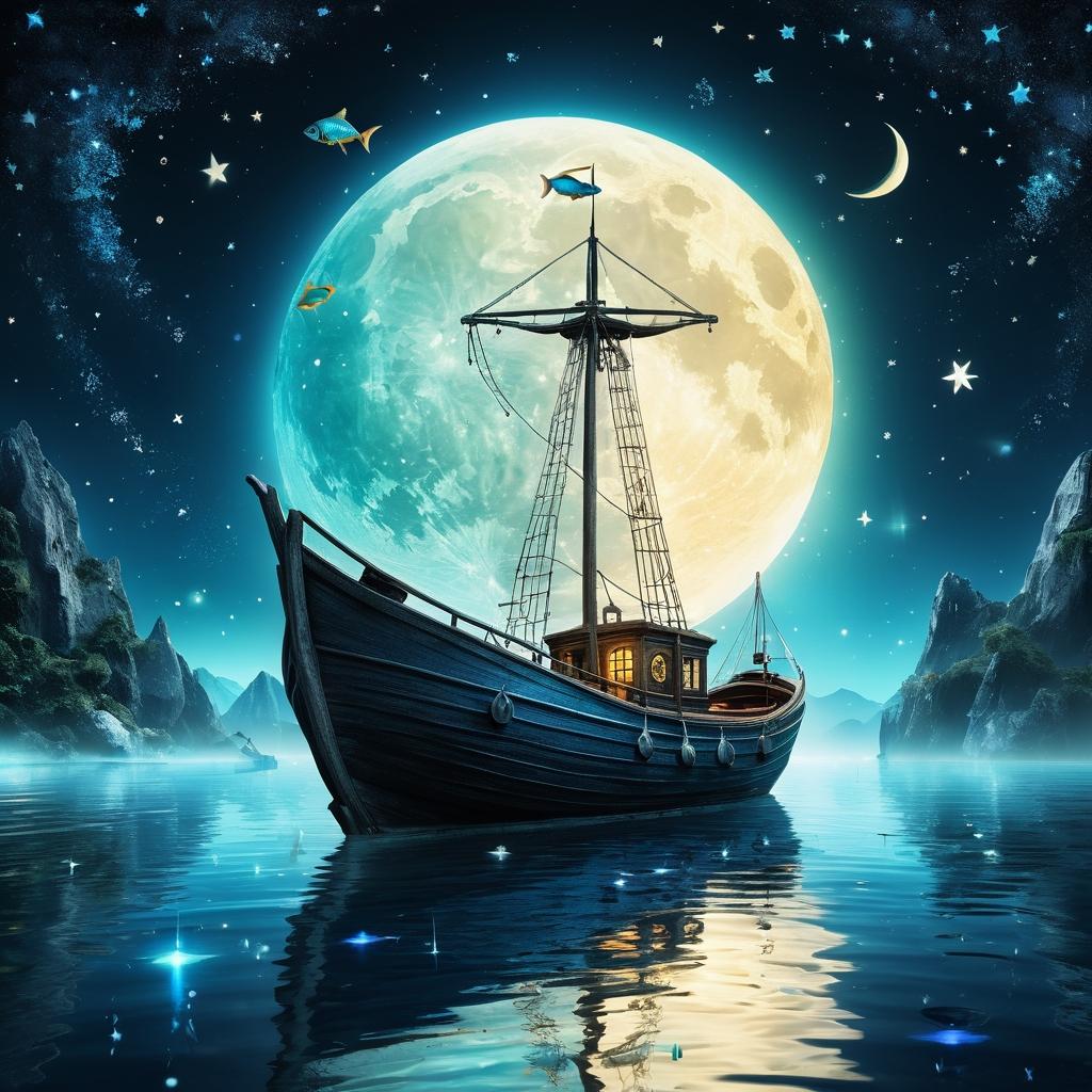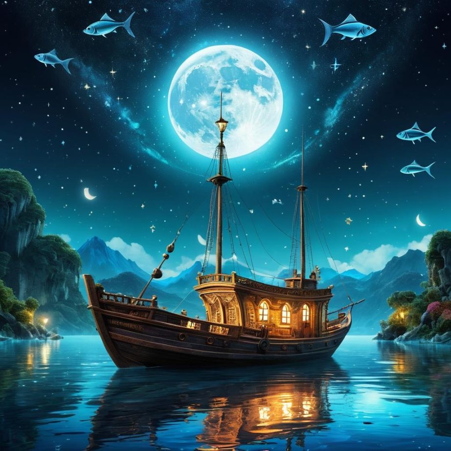 将船设计成一艘幻想船,它可以在星空中航行。水波变成了银河,鱼在星空中游动。月亮可以变成一个充满魔法的发光体,象征梦想的引导。