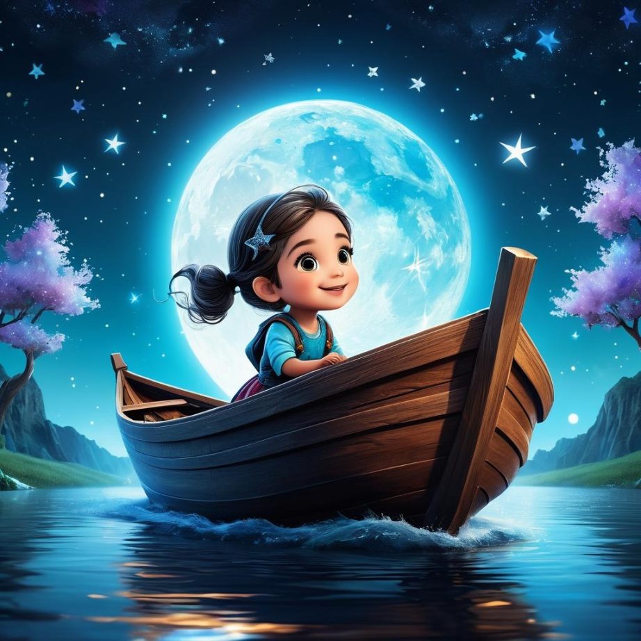 在图像分析中,我们发现具象物体如小船、人物与海浪,通过鲜明的色彩和简单的线条勾勒出一个充满童趣的场景。虚构元素如星星和月亮则增强了画面的幻想氛围。结合创作者的意图,我们可以将这幅画转化为一个充满故事感的插画设计。通过让星星发光并设计为守护者角色,与小船和人物互动,增强画面的叙事性。利用光线来强调星空的梦幻感,再通过色彩的渐变丰富海浪的动态,最终创造出一个兼具视觉吸引力和艺术表达的作品。