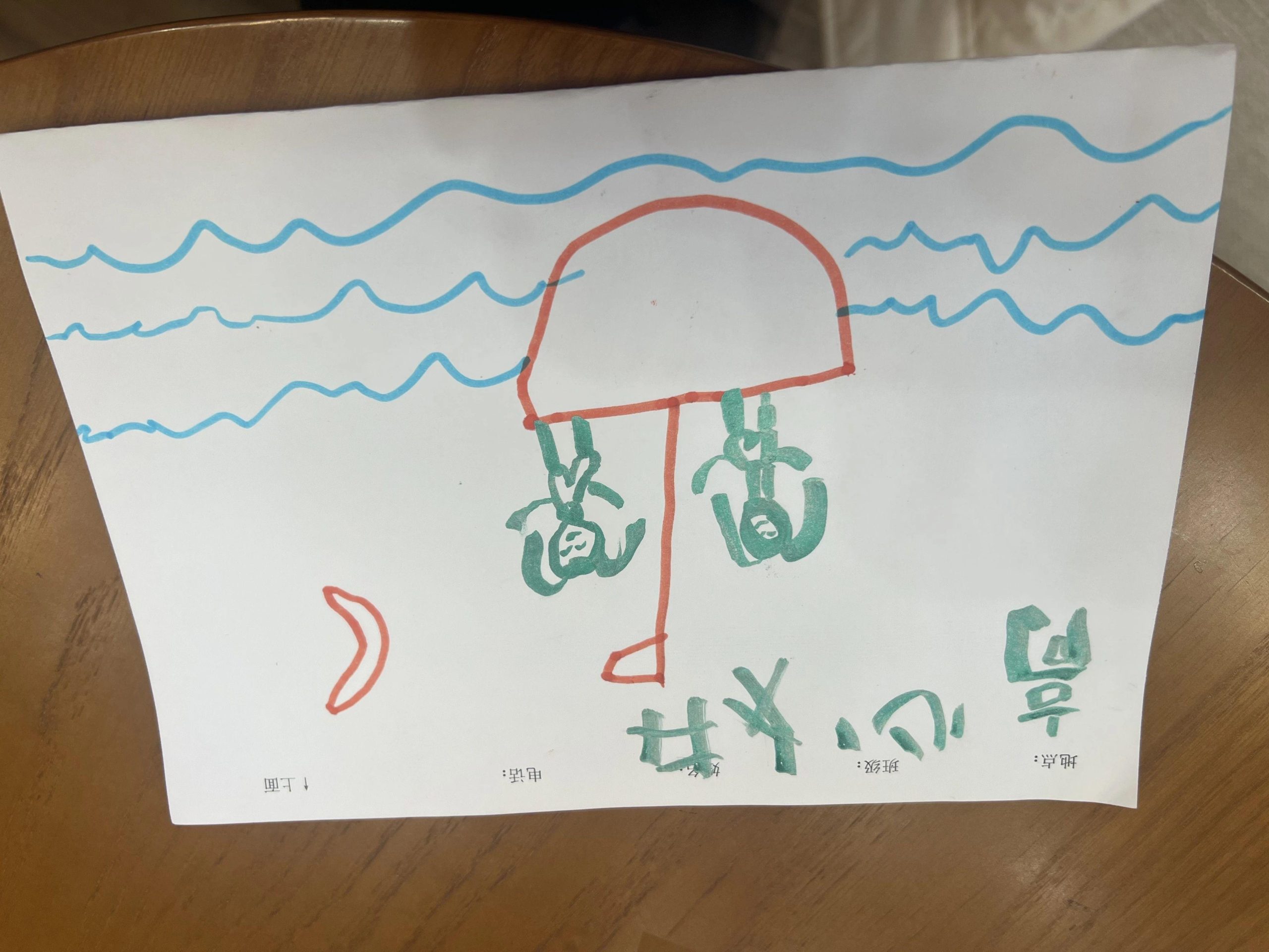 这幅图画展示了一个简单而富有童趣的插画风格。画面中有一个红色的伞状物体,像是一个伞或蘑菇,下面有两个人物形象,似乎悬挂在伞下。背景是蓝色的波浪线,象征水面或天空。左下角有一个红色的弯曲形状,可能代表月牙或船。图中的元素简单且色彩鲜明,呈现出一种幻想与现实结合的风格。