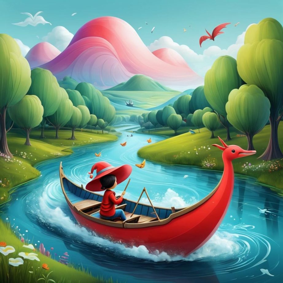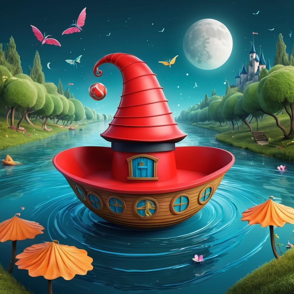 可以将伞状物体设计成一个巨大的幻想生物的帽子,人物形象作为它的朋友或守护者。背景的波浪线可以转化为漂浮在空中的幻想之河,红色弯曲形状变成一只小船,带来冒险的感觉。