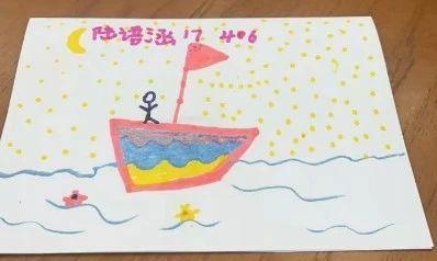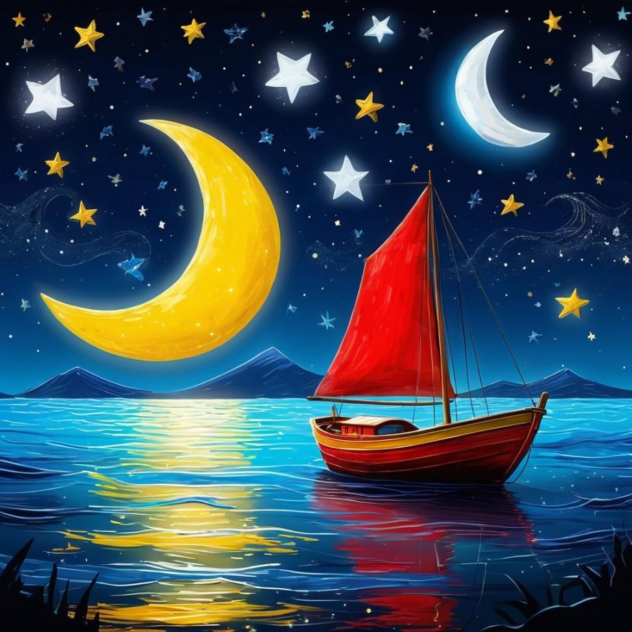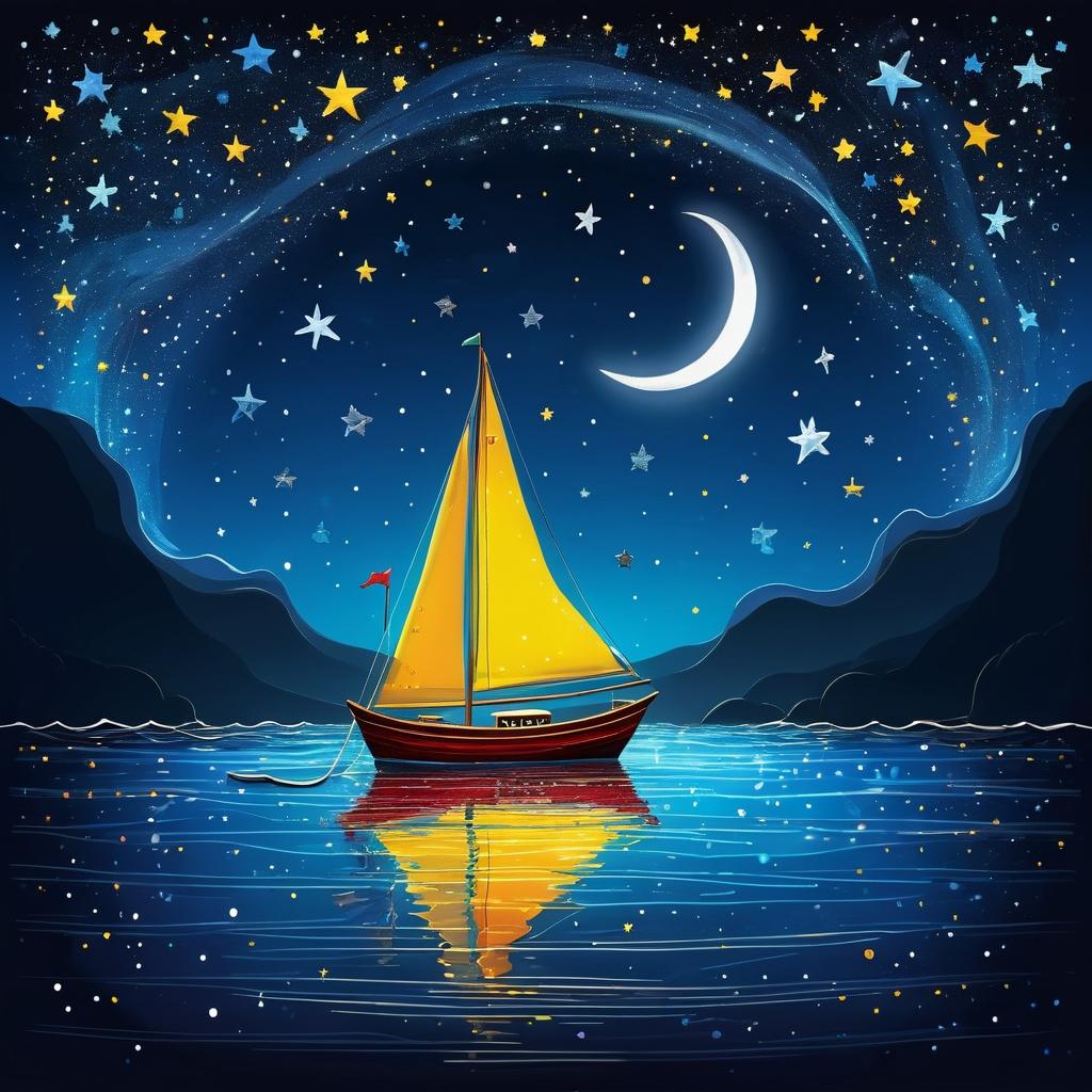 这幅画由一个简单的儿童画风格构成,主要元素包括一艘船、旗帜、月亮和星星。色彩鲜艳,使用了红色、黄色和蓝色,传达出一种欢乐和探索的情感。画面中小船在波浪上航行,背景星星点缀着夜空,表达了一种冒险和无忧无虑的童真。