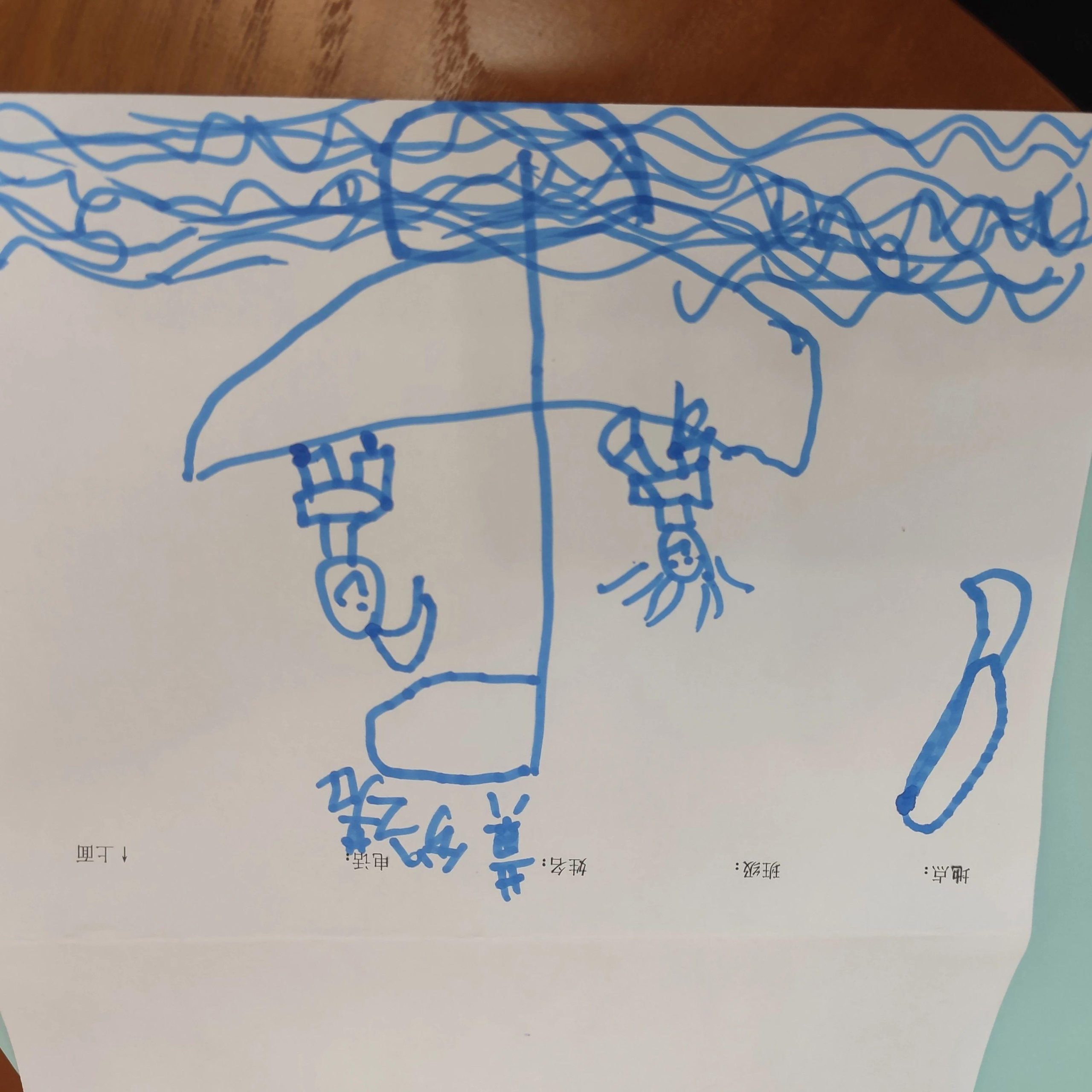 这幅插画展示了两个倒挂的人物角色,他们悬挂在一个类似雨伞的结构上方,背景中有波浪形的线条可能代表水波或云层。角色的简单面部表情和线条身体传达了一种轻松和快乐的氛围。右侧的形状可能是一个奇异道具,增加了画面的趣味性。
