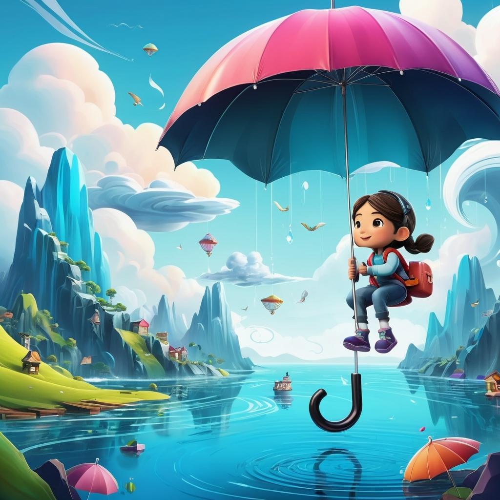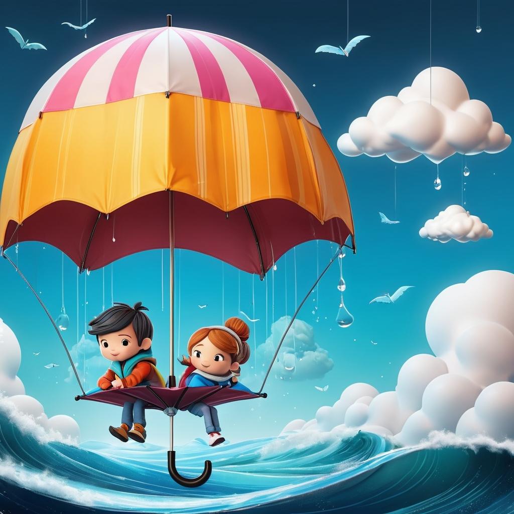 在这幅插画中,两个人物角色以倒挂的姿态呈现,悬挂在一个伞状的结构上方。这种布局给人一种轻松而愉快的感受,背景中波浪形的线条可能象征着水波或云层,为画面增添了梦幻的气息。通过分析这些具象和虚构元素,可以将其转化为一个充满童趣和故事性的插画设计。将背景色彩丰富化,并赋予右侧的奇异道具以魔法属性,可以使其与角色产生互动,从而增强画面的叙事性与视觉吸引力。利用光线、色彩和细节来丰富作品的艺术表达,使其不仅仅是一幅简单的画作,而成为一个引人入胜的幻想场景。