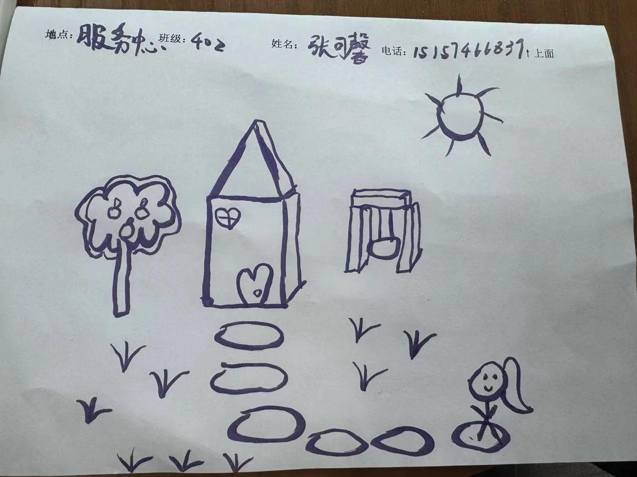 这幅简单的插图展示了一棵树、一座房子、一个秋千、太阳以及一个人物角色。这些具象物体通过简单的线条和形状勾勒,呈现出一种童趣和纯真的氛围。树和房子象征自然与家园,秋千则暗示着快乐的户外活动。人物角色位于场景的右下角,给画面增添了生动的元素。