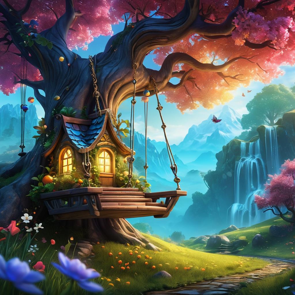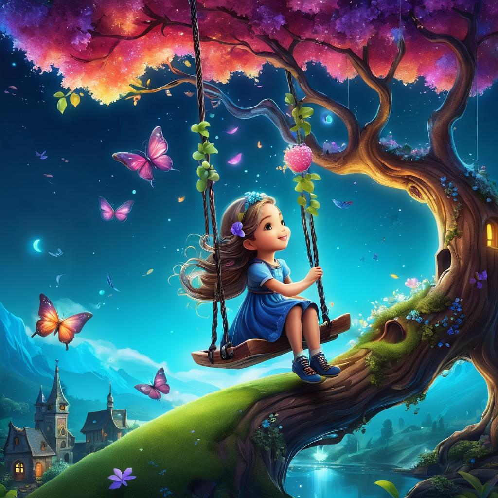 在分析这幅童趣插画时,我们注意到其中简单的具象物体,如树、房子、秋千和人物角色。这些元素通过线条和形状构成一个和谐的场景。为了增强画面的故事性与视觉吸引力,可以引入虚构元素,比如发光果实、魔法秋千和会移动的房子。这些幻想元素与具象物体互动,能有效地增强画面的叙事性,同时利用光线、色彩与细节使作品更具艺术表现力。通过细致的纹理和生动的色彩渐变,画面不仅展现了童趣,还激发了观众的想象力。